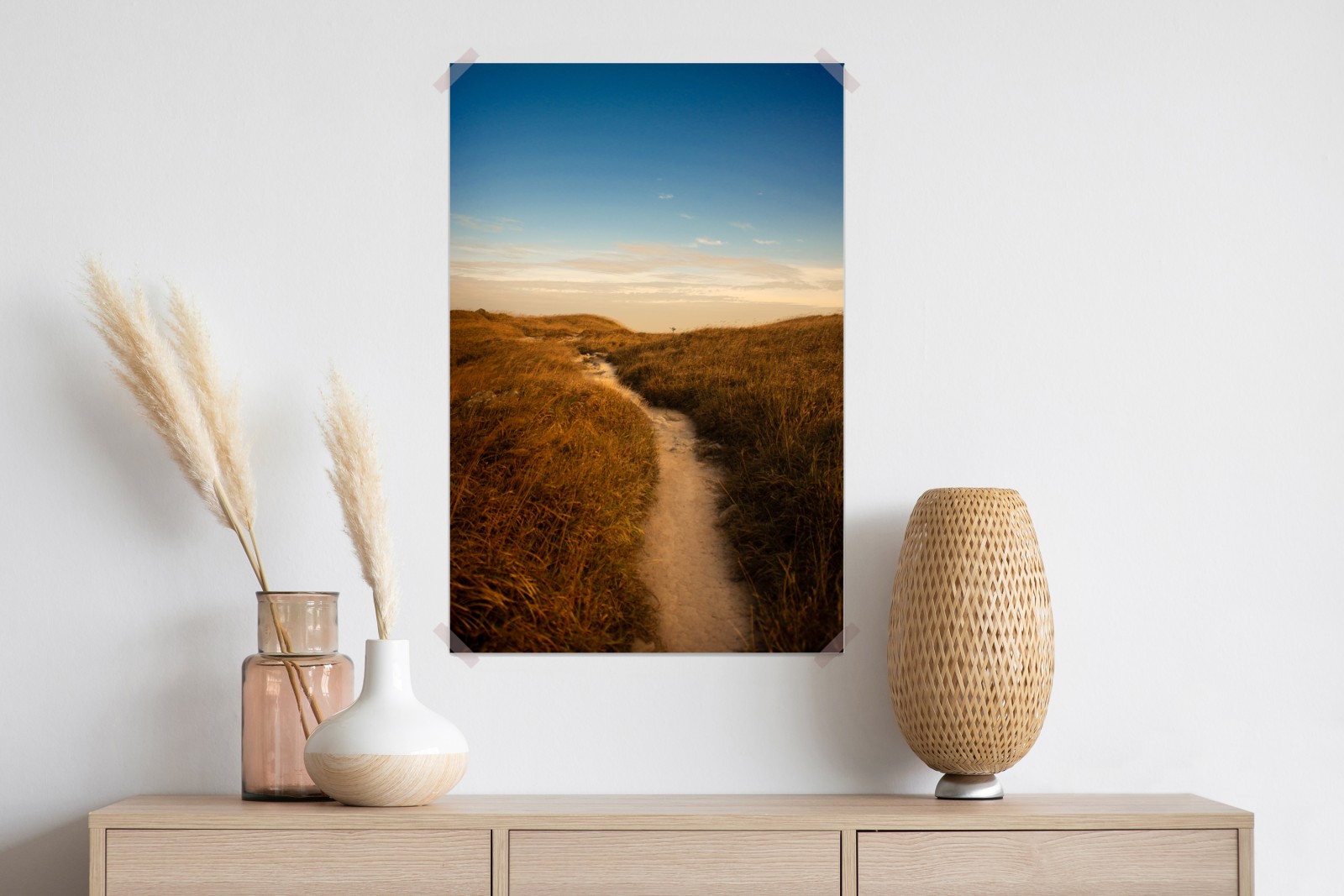 Bringen Sie ruhige Küstenatmosphäre in Ihr Zuhause mit diesem Bild eines sonnenbeschienenen Dünenpfads, goldenen Grases und weitem blauen Himmel.