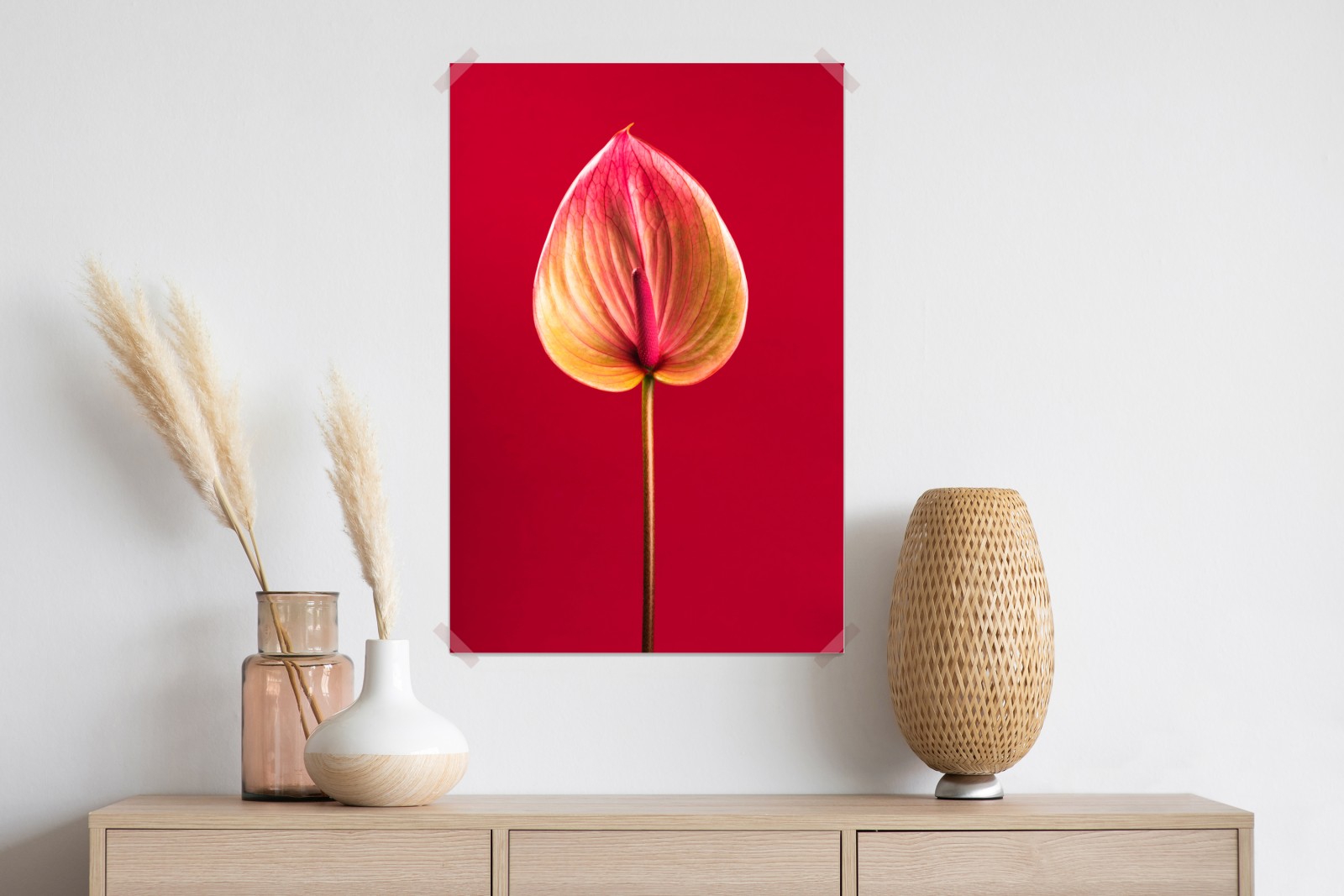 Bringen Sie kühne botanische Eleganz in den Raum mit einer minimalistischen Nahaufnahme eines einzelnen Anthuriums vor lebhaft rotem Hintergrund.