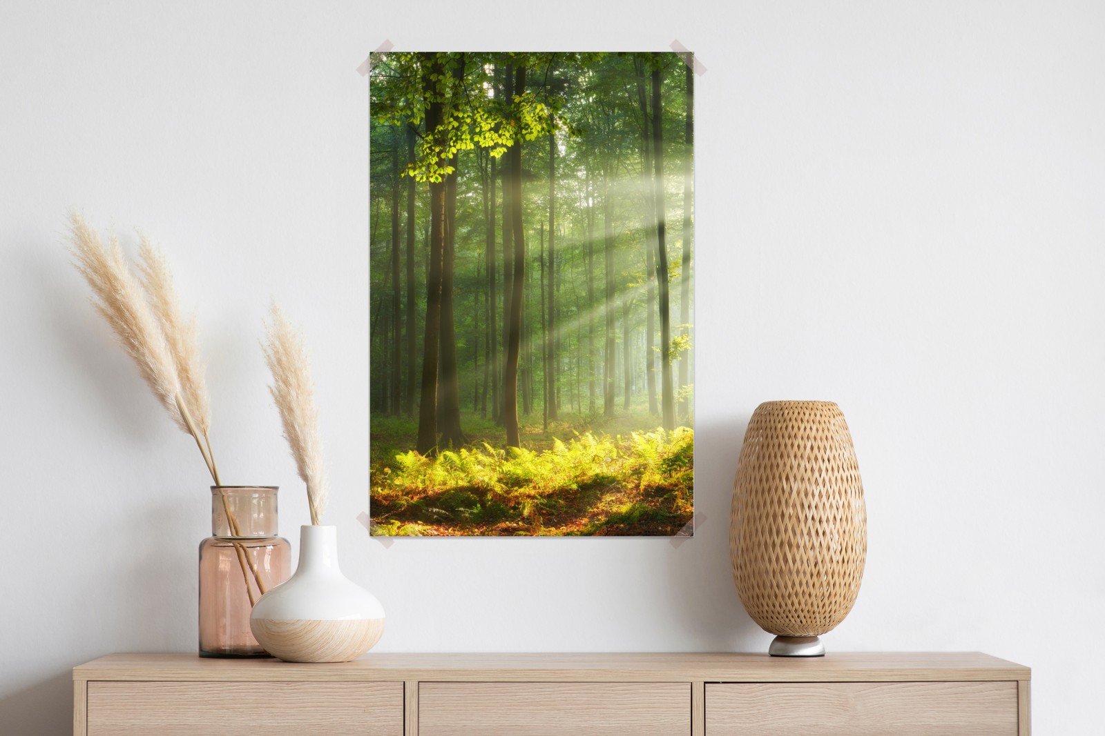 Bringen Sie Ruhe und natürliche Schönheit in Ihr Zuhause mit dieser sonnenbeschienenen Waldszene, in der Morgenlicht durch die Bäume fällt.