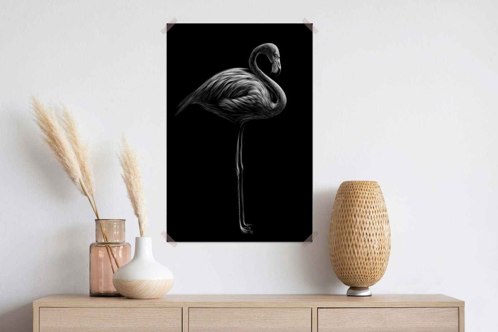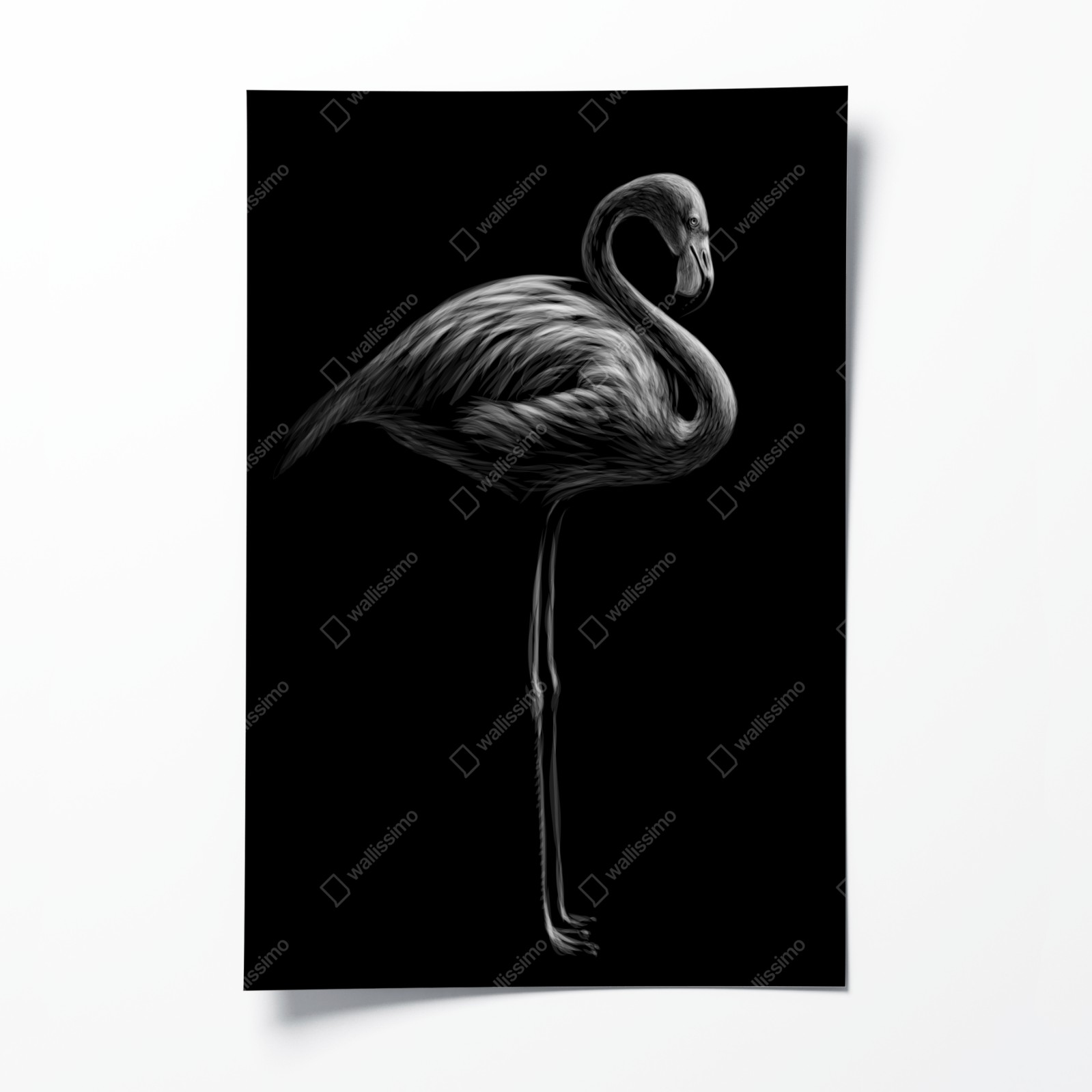 Elegantes Graustufenbild eines Flamingos, das minimalistischen Stil und starken Kontrast in moderne Räume bringt.