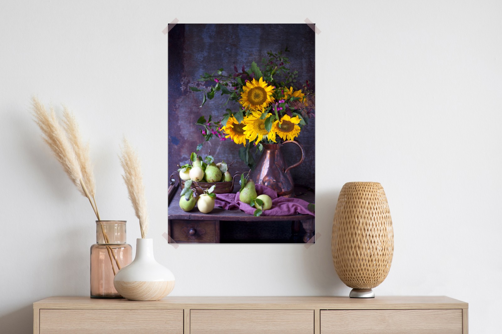 Warme Sonnenblumen und reife Birnen bilden ein rustikales Stillleben, das herbstliche Atmosphäre in Ihr Zuhause bringt.