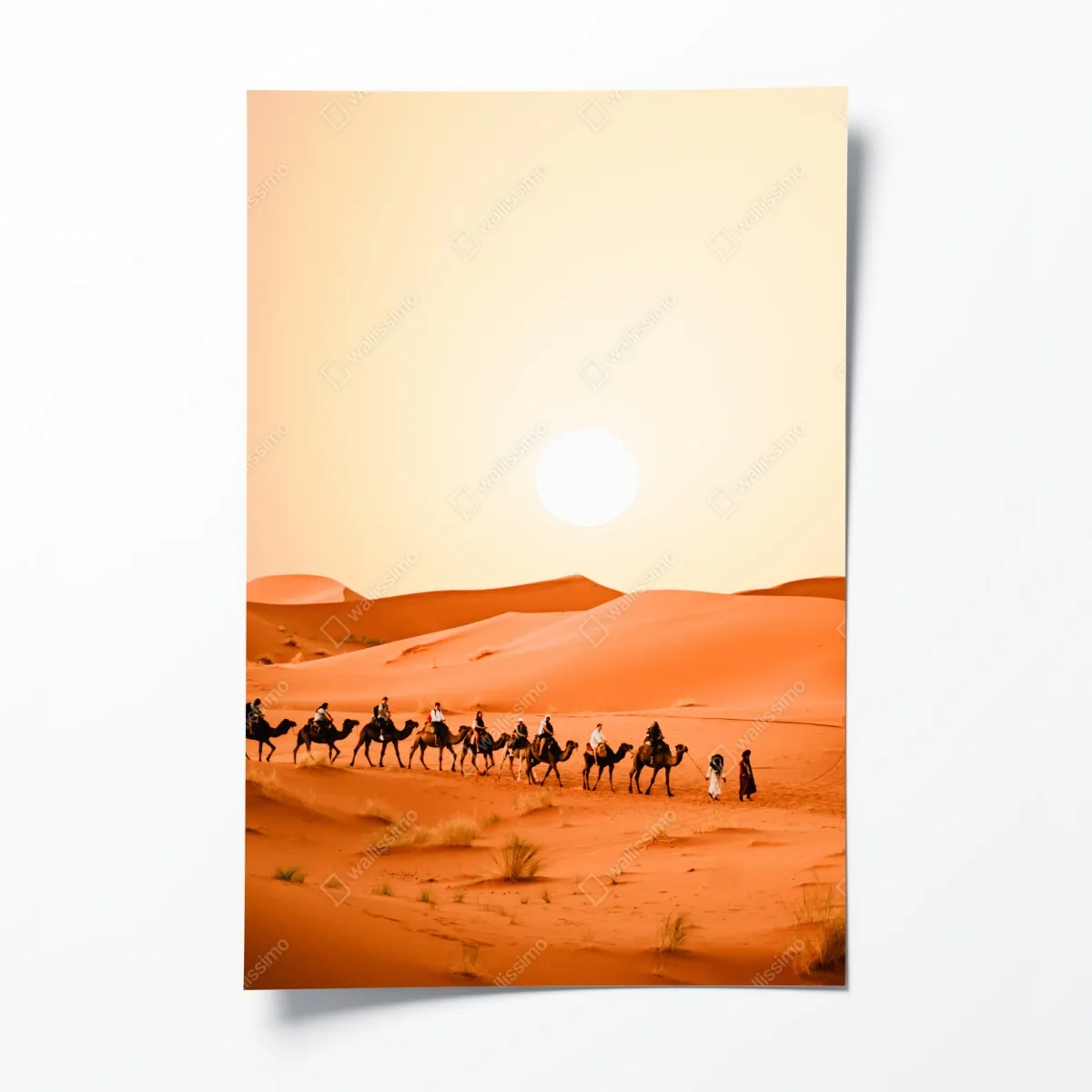Erleben Sie die ruhige Schönheit einer Kamelkarawane, die bei Sonnenuntergang über goldene Dünen zieht, und verleihen Sie Ihrem Raum warme, exotische Stimmung.