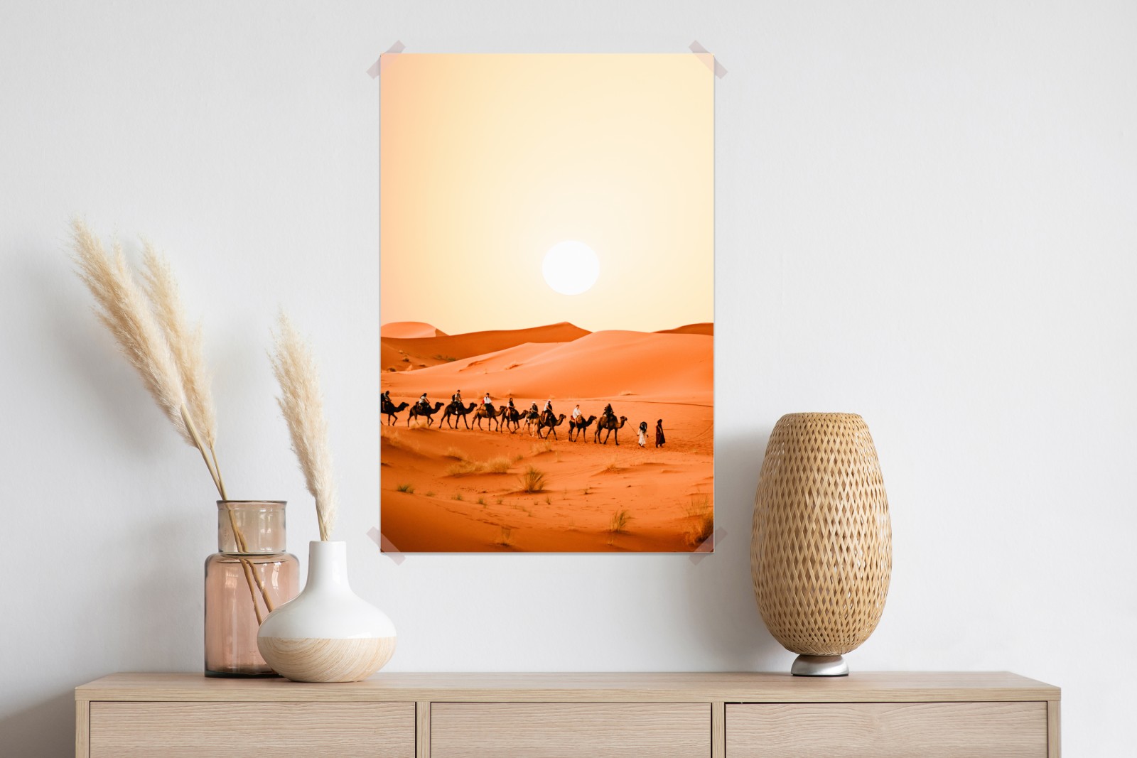 Poster Karawane von kamelen in der wüste bei sonnenuntergang