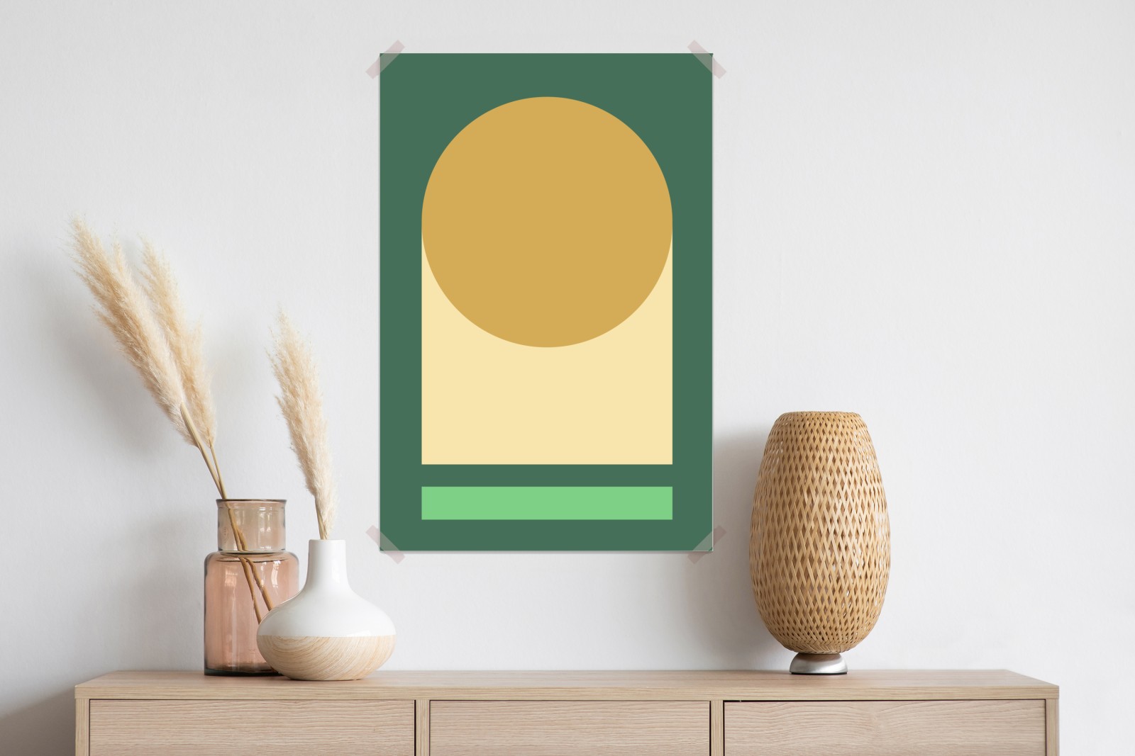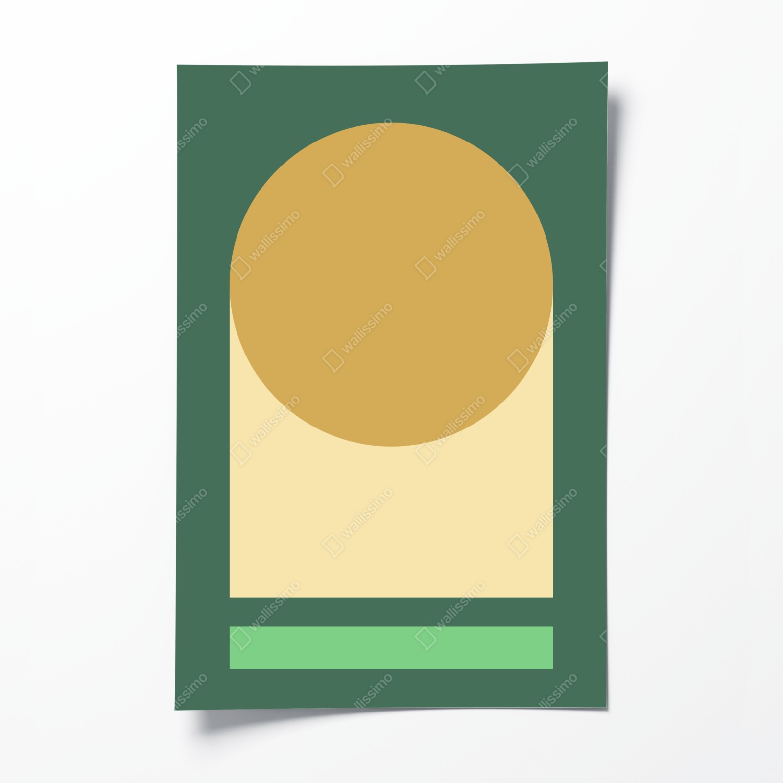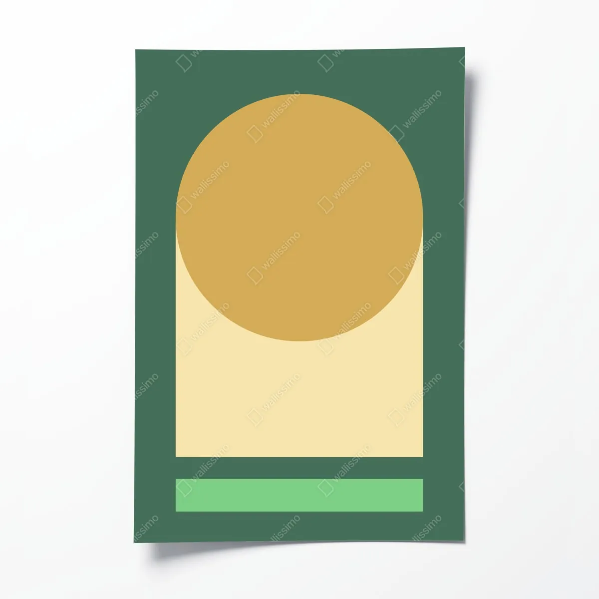 Bringen Sie Ruhe und modernen Stil in Ihren Raum mit dieser minimalistischen geometrischen Komposition in warmen Gold- und Grüntönen.