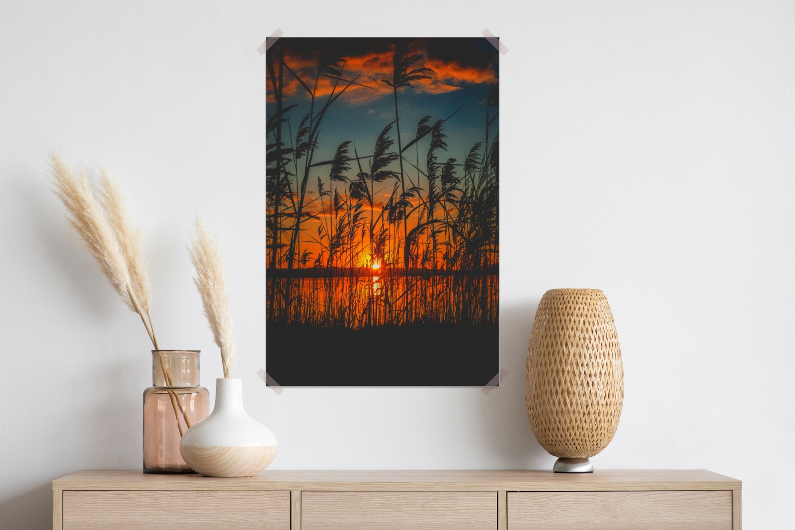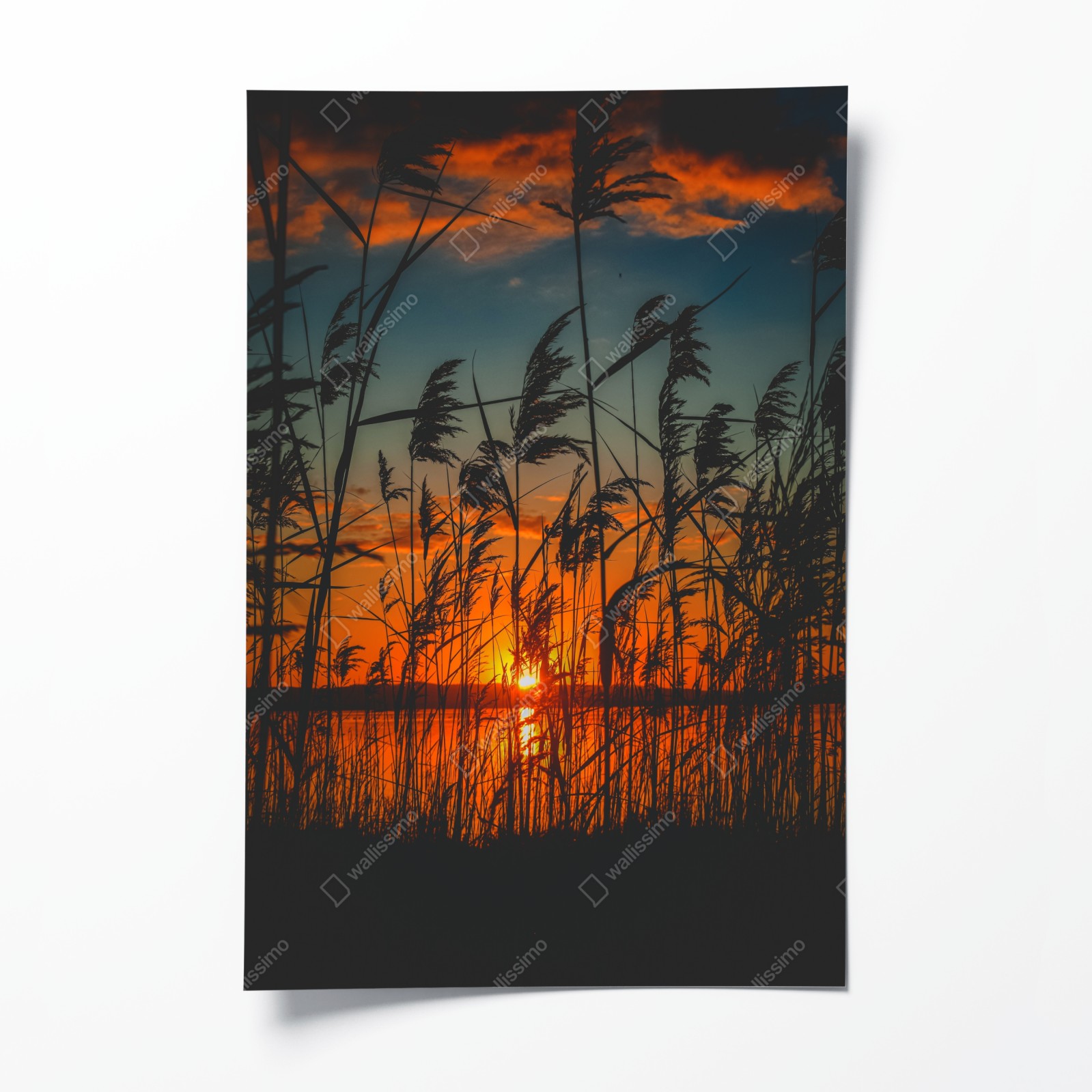 Poster sonnenuntergang am see mit schilf-silhouette – Wallnifity®