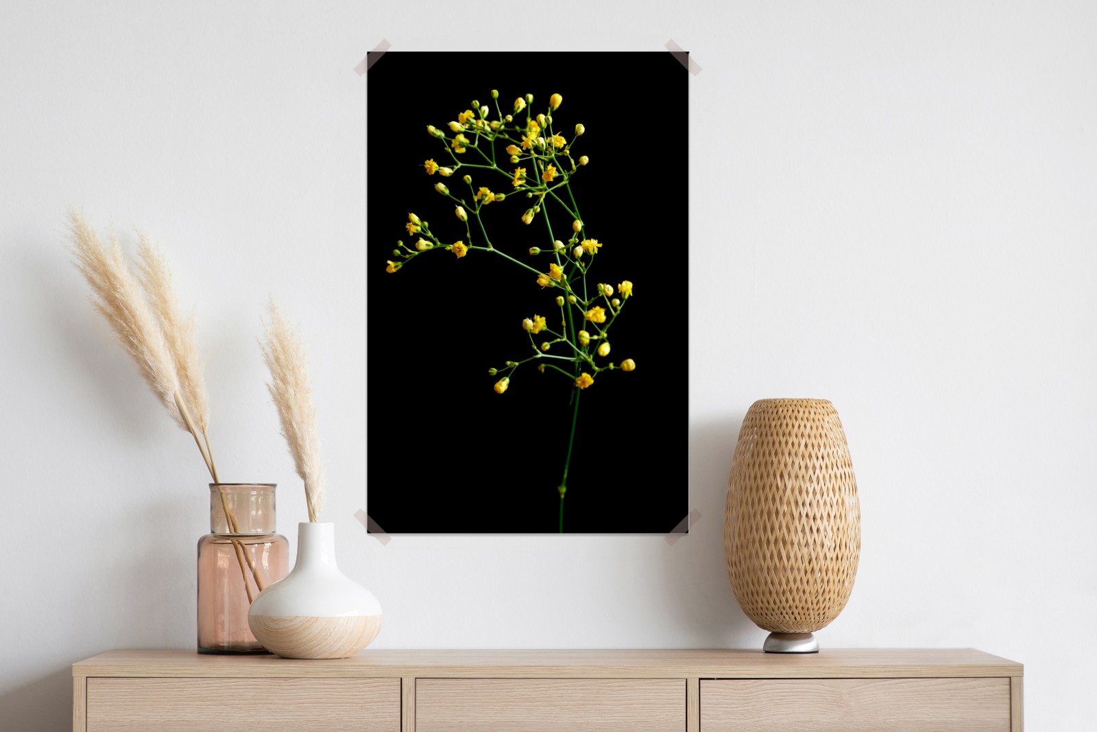 Poster zartes gelbes schleierkraut auf schwarzem hintergrund – Wallnifity®