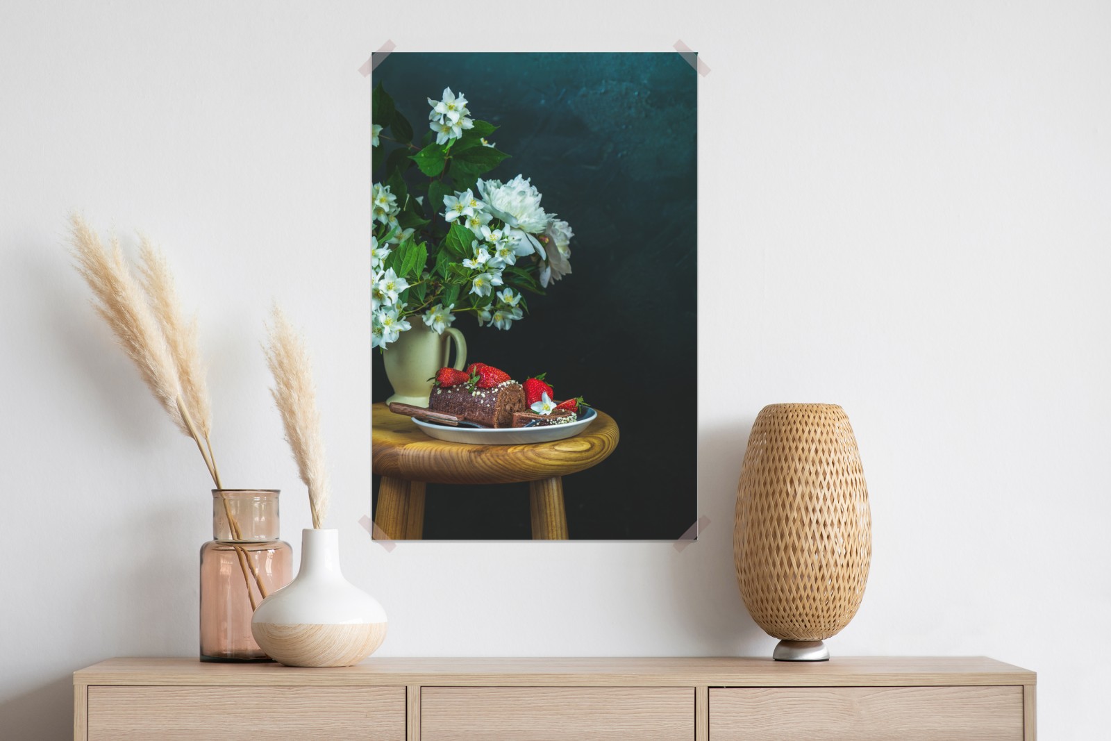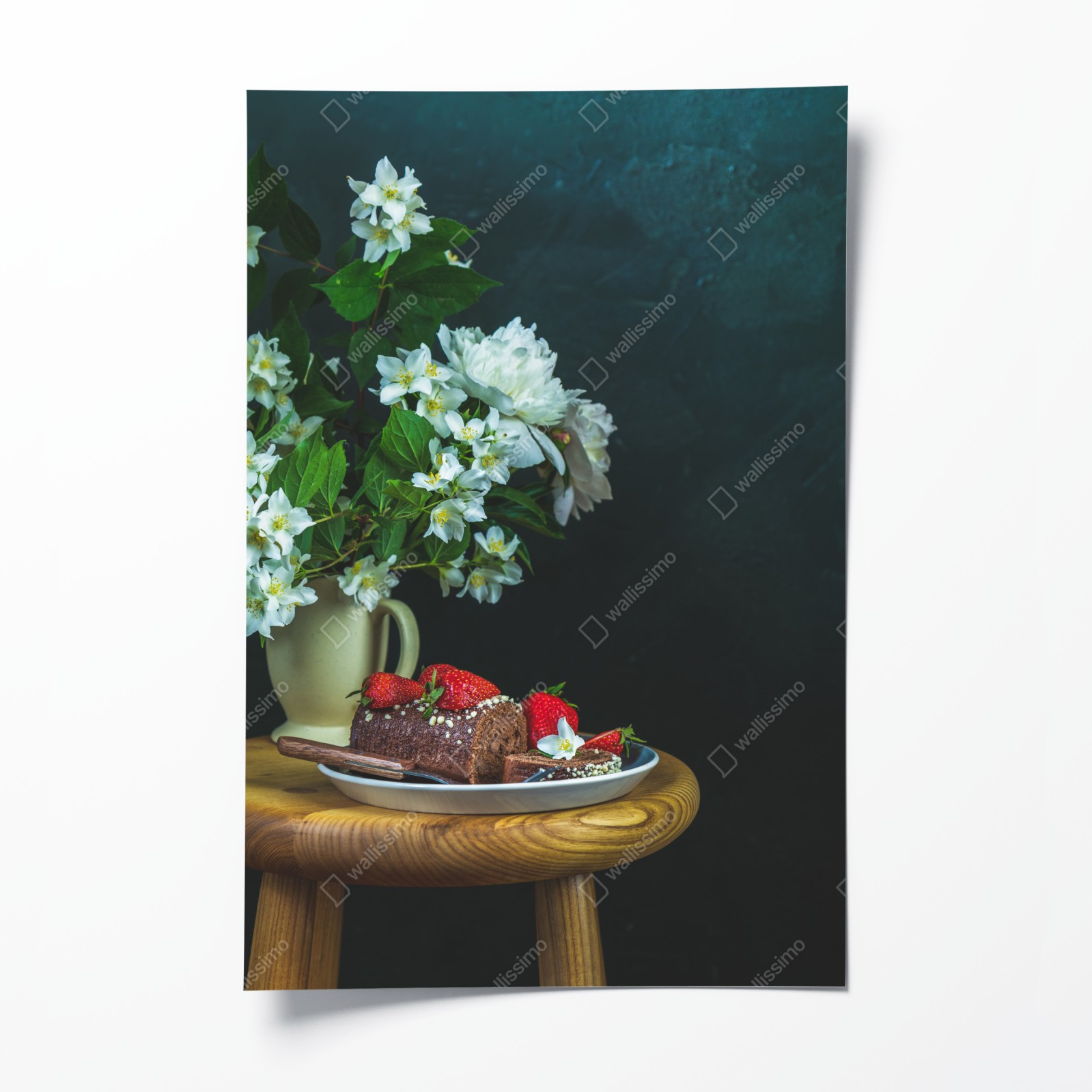 Poster Schokoladenrolle mit erdbeeren und weißen blüten