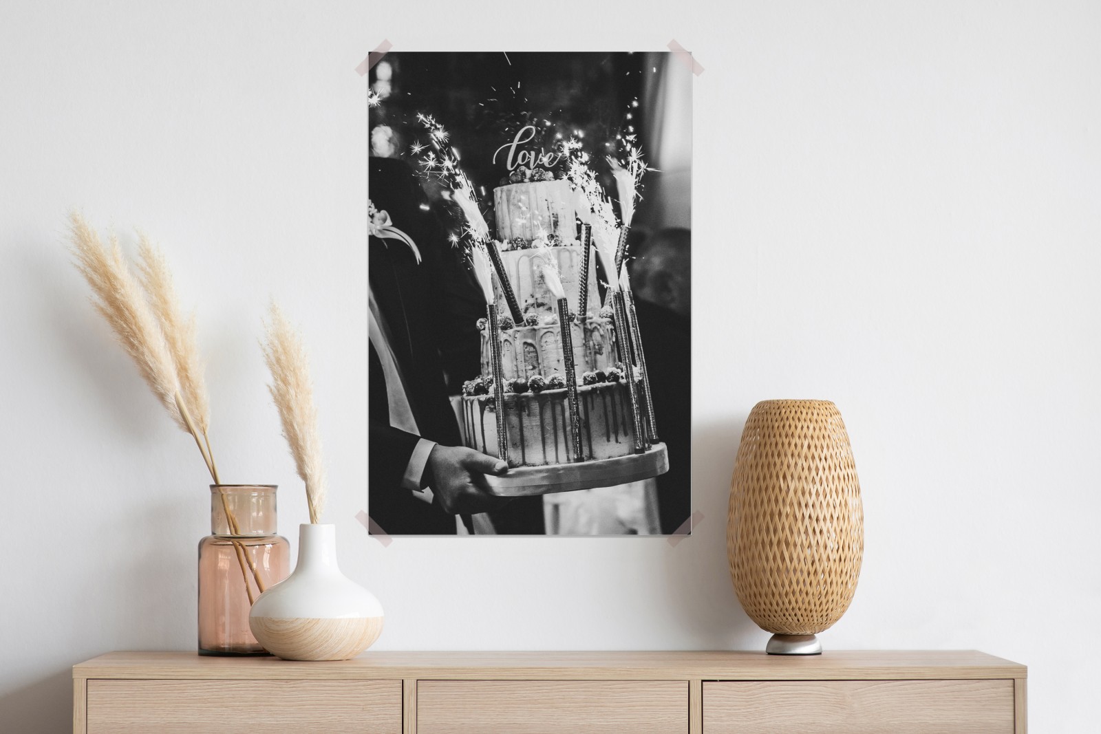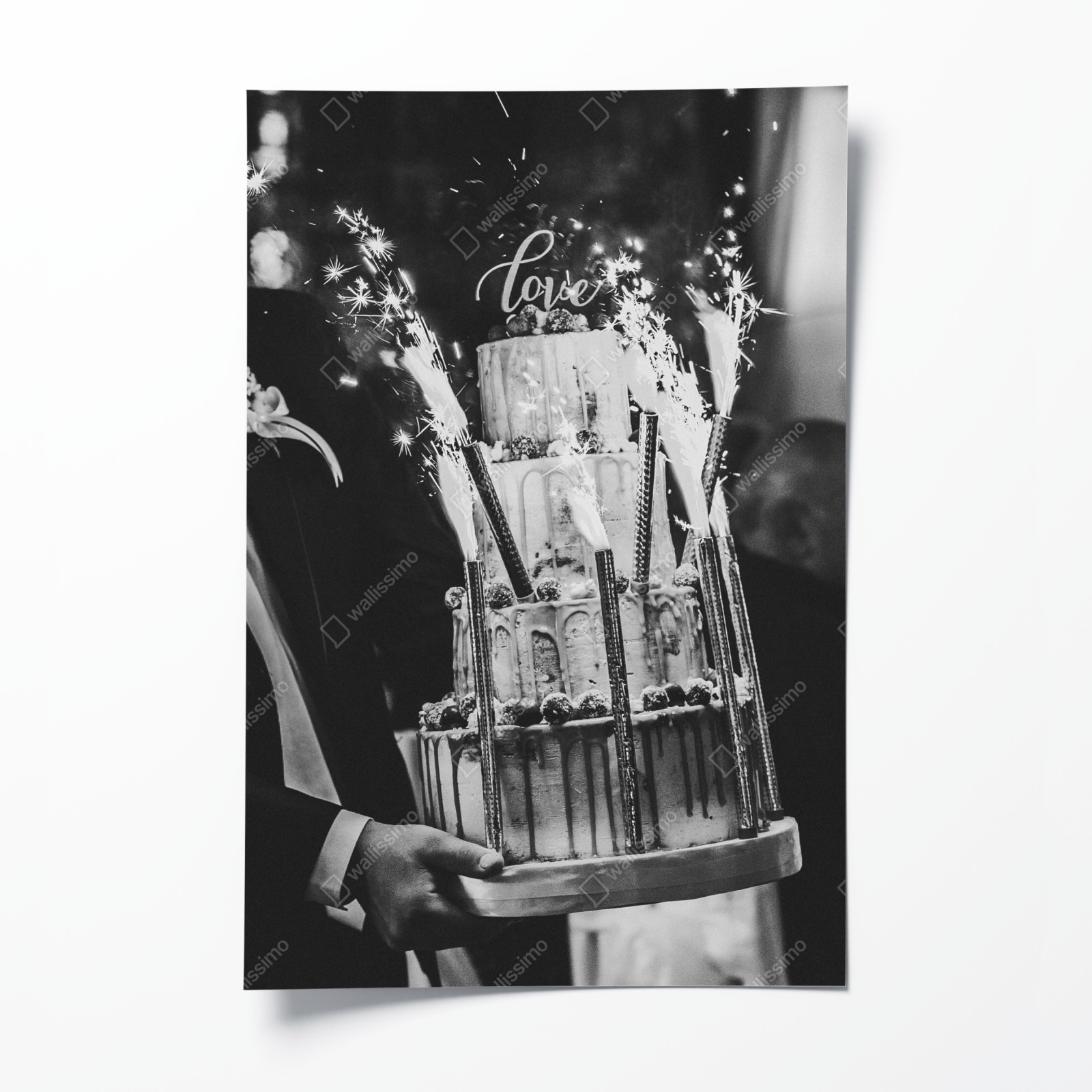 Feiern Sie zeitlose Romantik mit diesem schwarz-weißen Bild einer rustikalen Hochzeitstorte mit Wunderkerzen, perfekt für das Esszimmer.