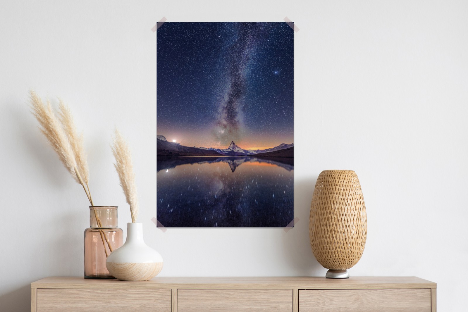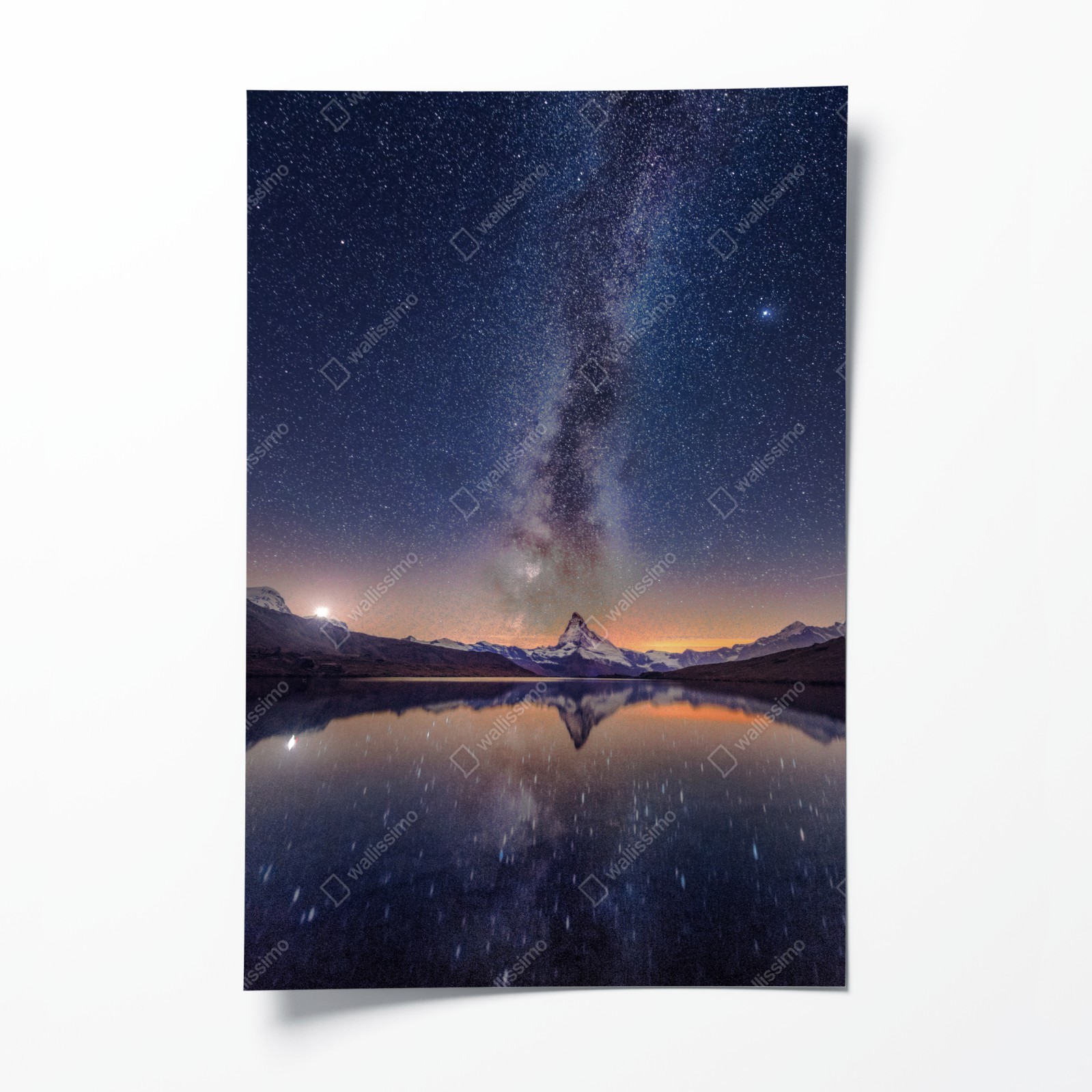Bringen Sie das Staunen des Nachthimmels in Ihr Zuhause mit der dramatischen Milchstraße über einem schneebedeckten Gipfel, gespiegelt in einem ruhigen Bergsee.