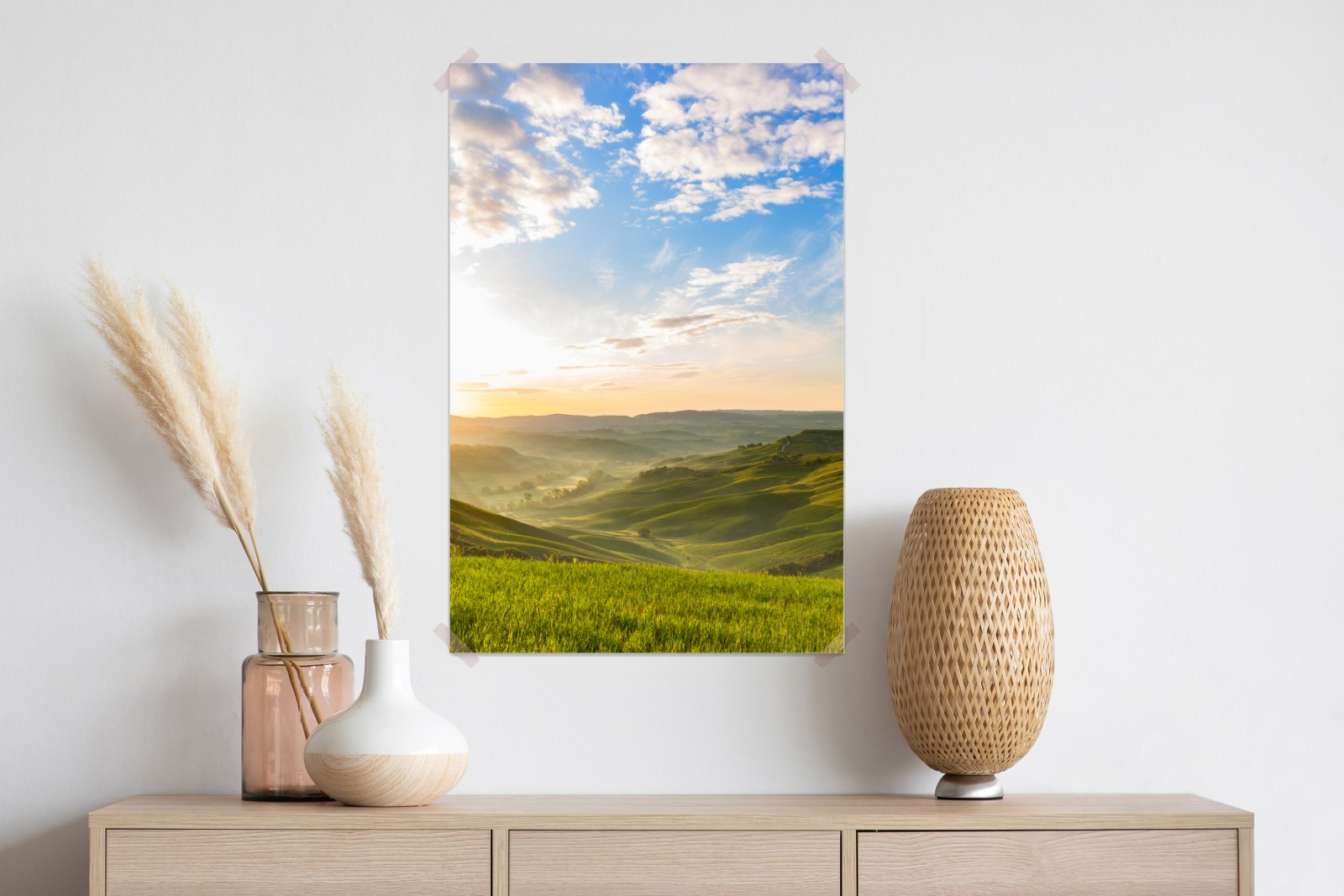 Bringen Sie die ruhige Schönheit eines nebligen Sonnenaufgangs über sanfte Hügel in Ihr Zuhause mit warmen Farben und natürlicher Atmosphäre.