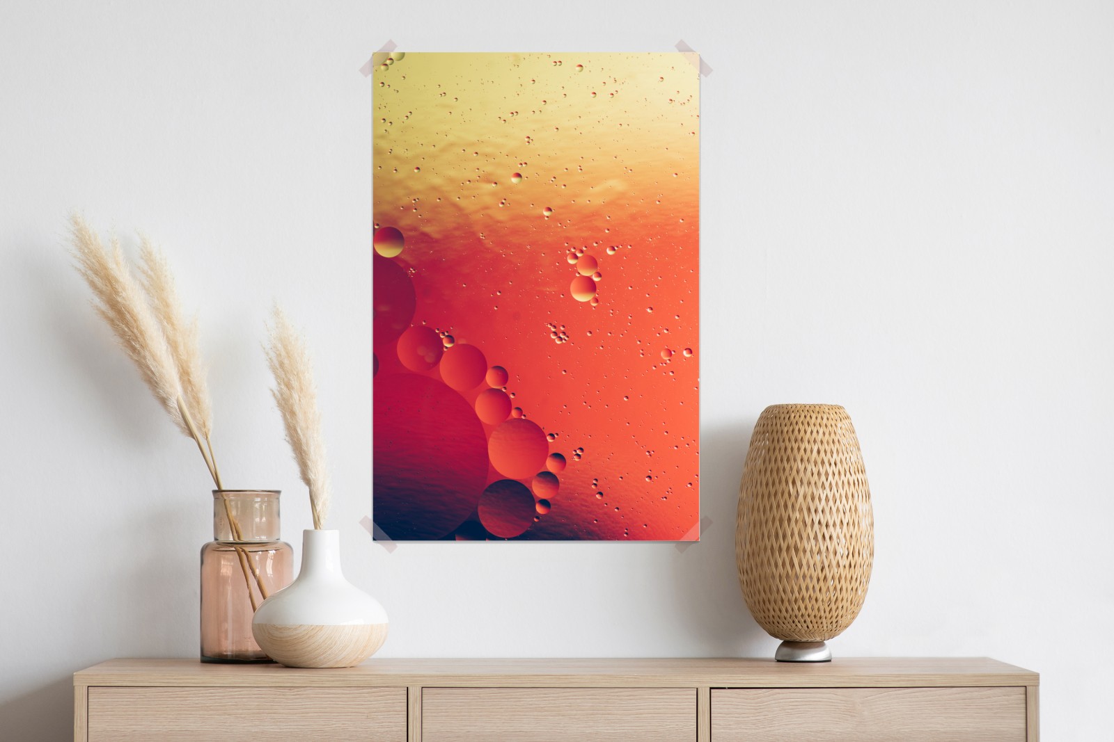 Verleihen Sie Ihrem Raum eine warme, moderne Note mit dieser lebendigen abstrakten Komposition aus schwebenden Blasen und leuchtenden orangefarbenen Verläufen.