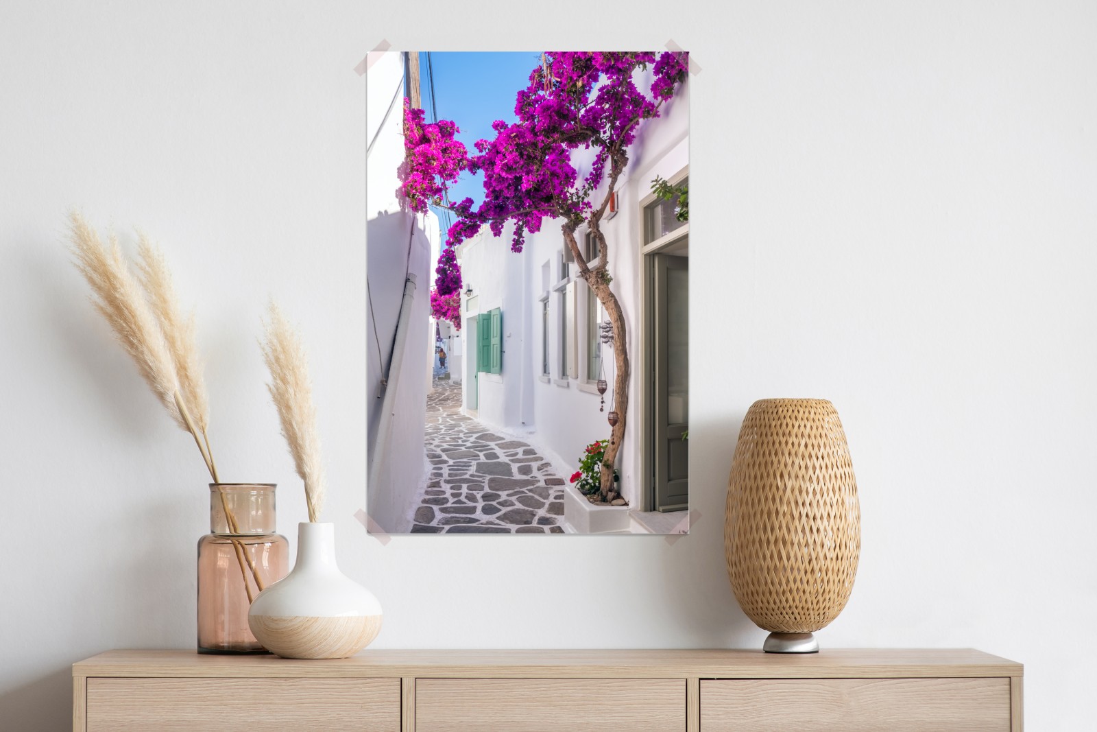 Bringen Sie den ruhigen Charme einer sonnigen mediterranen Gasse mit lebendiger Bougainvillea und weißer Architektur in Ihr Zuhause.
