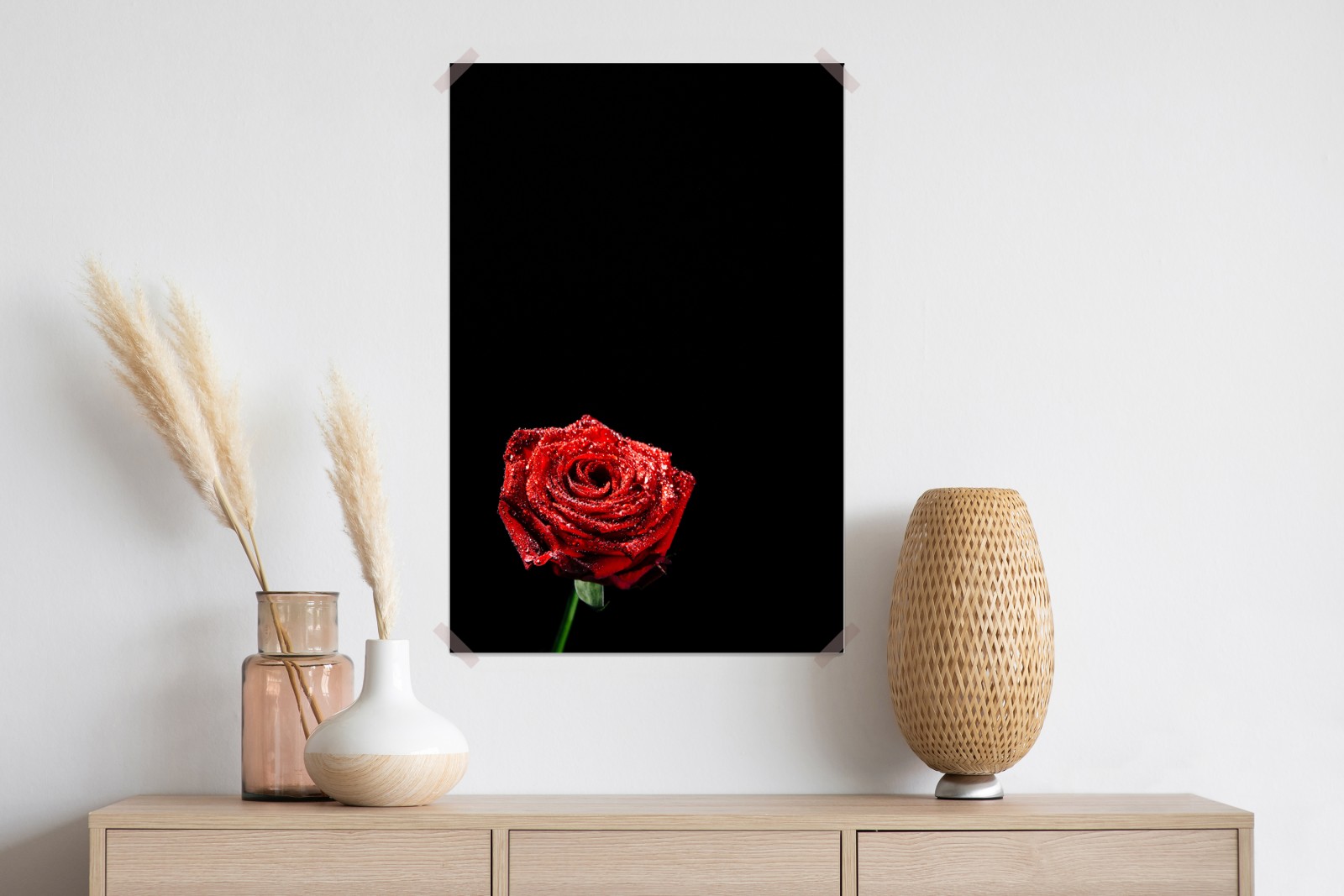 Poster Rote rose mit tautröpfchen vor schwarzem hintergrund