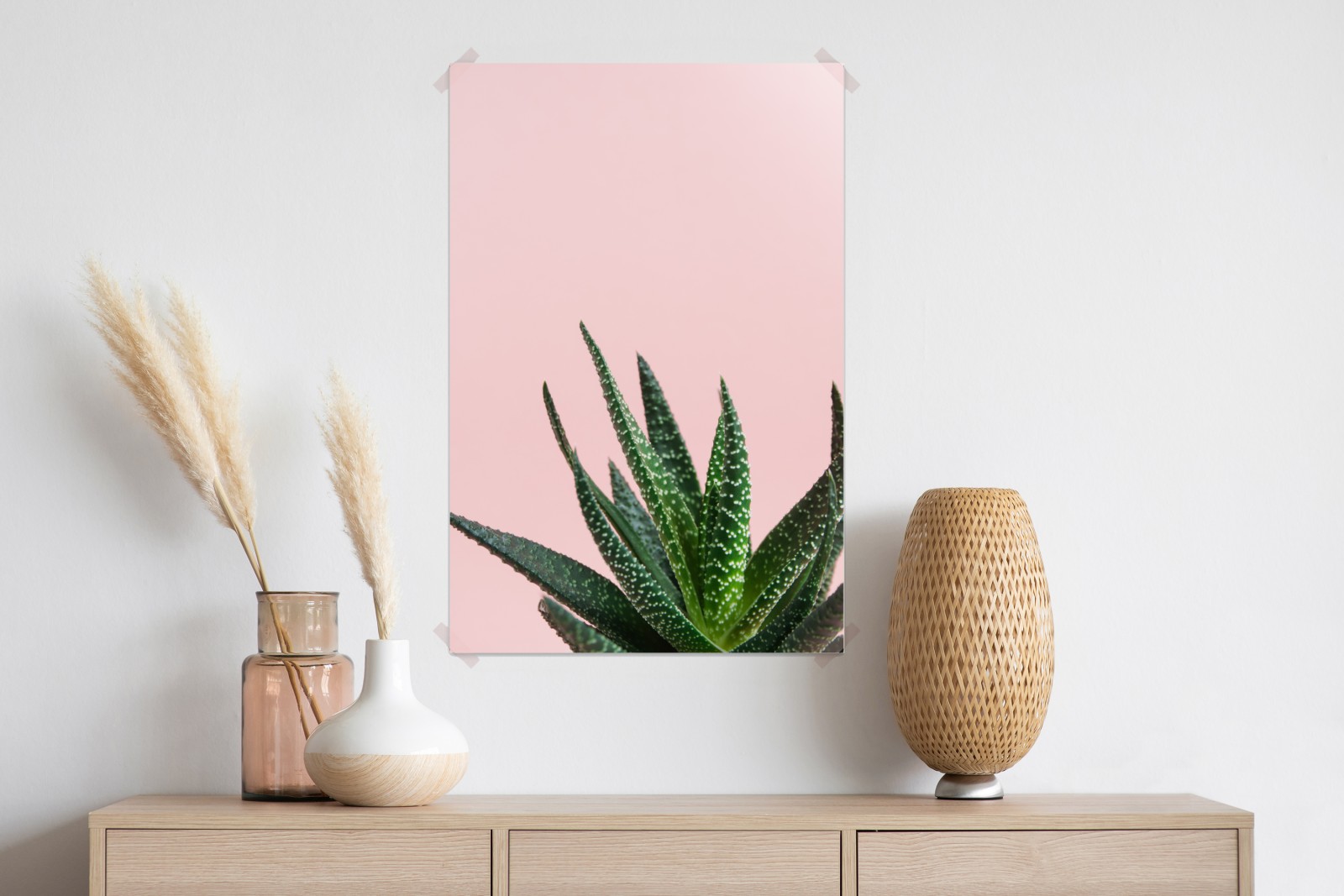 Fügen Sie mit einem lebendigen Aloe-Druck auf einem zarten rosa Hintergrund einen frischen, modernen Akzent zu Ihrem Raum hinzu.