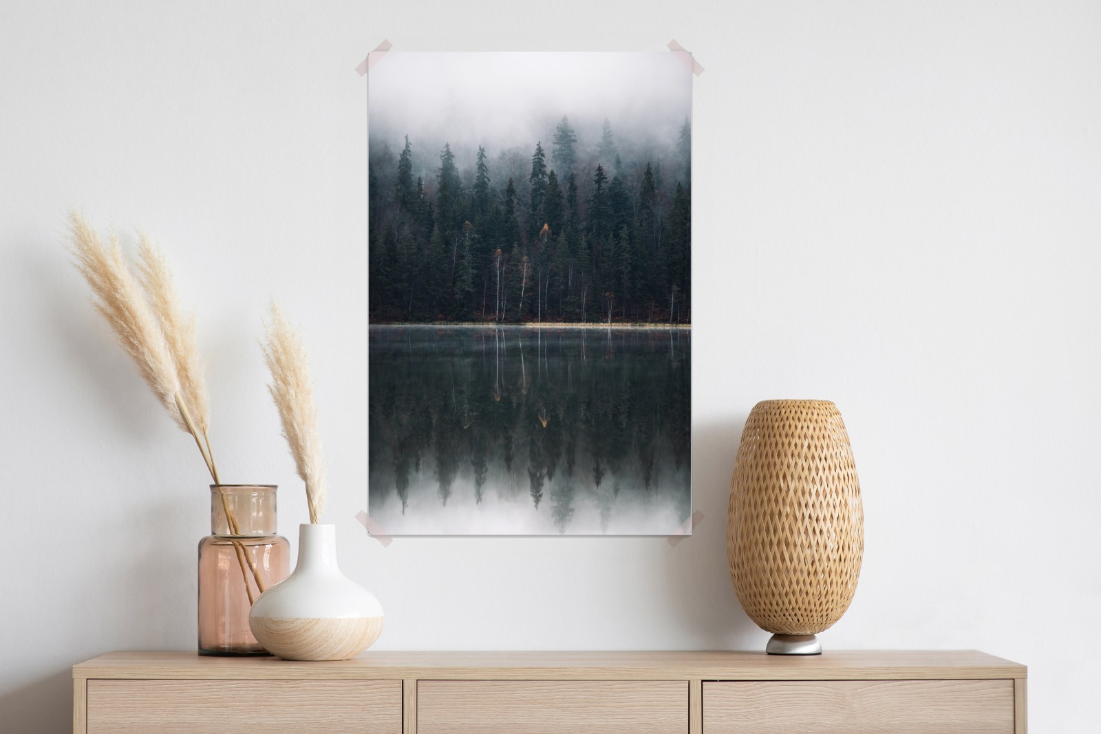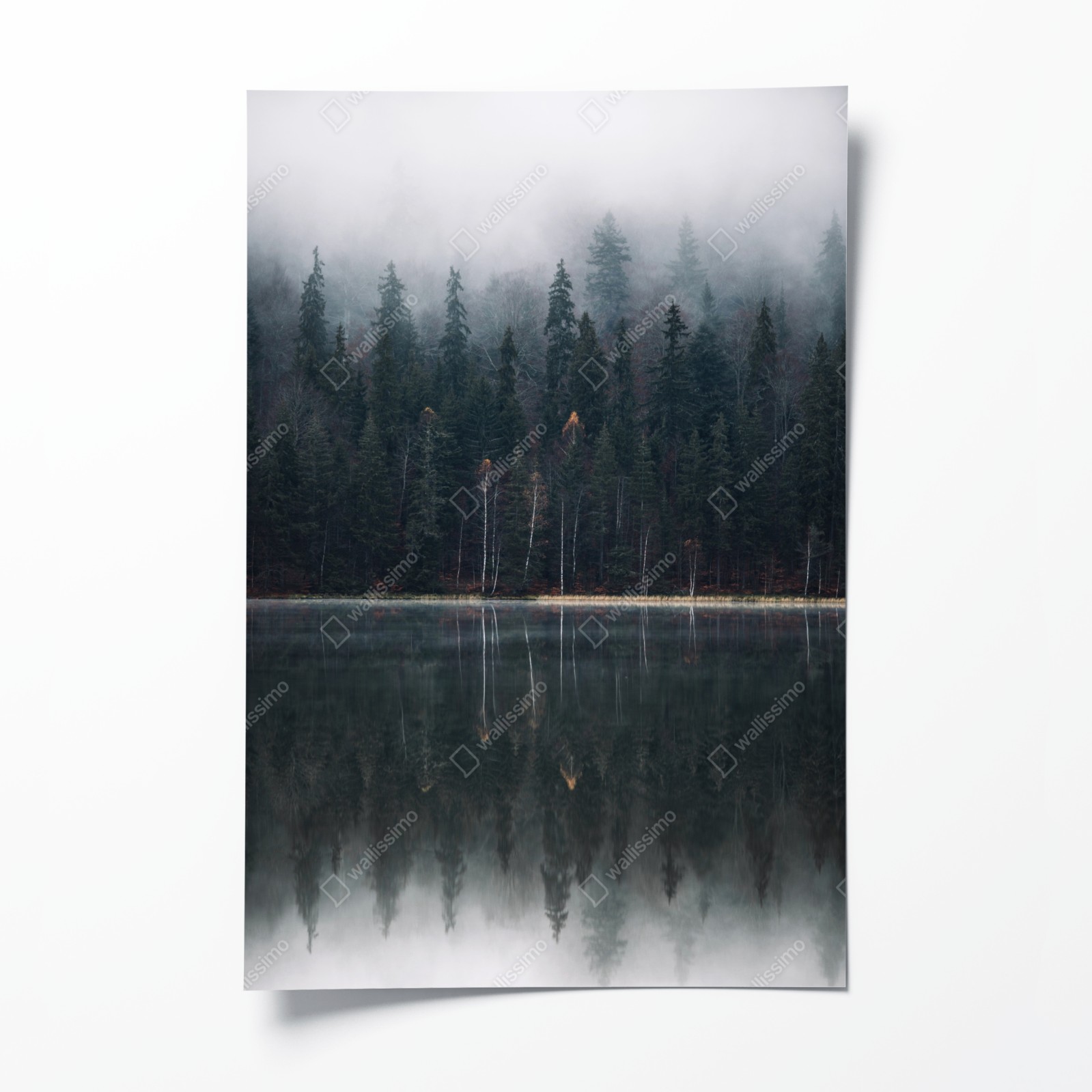Bringen Sie ruhige Waldatmosphäre in Ihr Zuhause mit diesem Bild einer nebligen Seespiegelung, das natürliche Schönheit und Gelassenheit ausstrahlt.