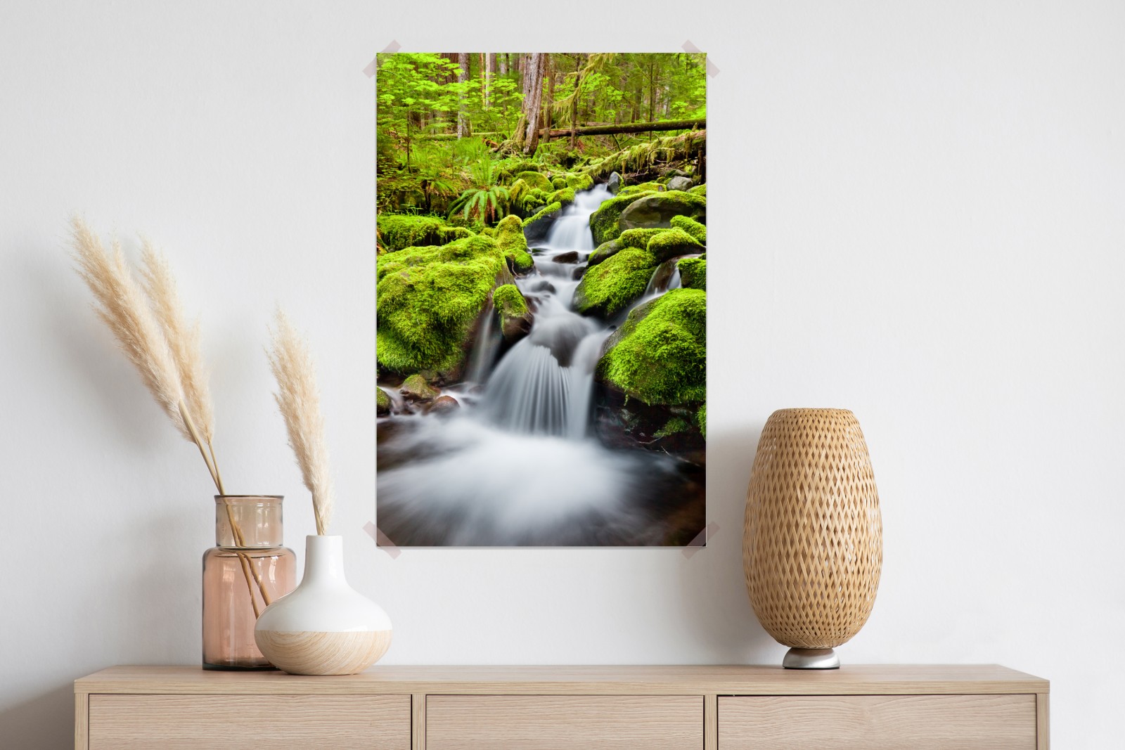 Bringen Sie die beruhigende Schönheit von Sol Duc Falls in Ihre Räume mit diesem lebendigen Druck, der einen moosbedeckten Bach und sanfte Kaskaden zeigt und perfekt ist, um natürliche Ruhe zu schaffen.