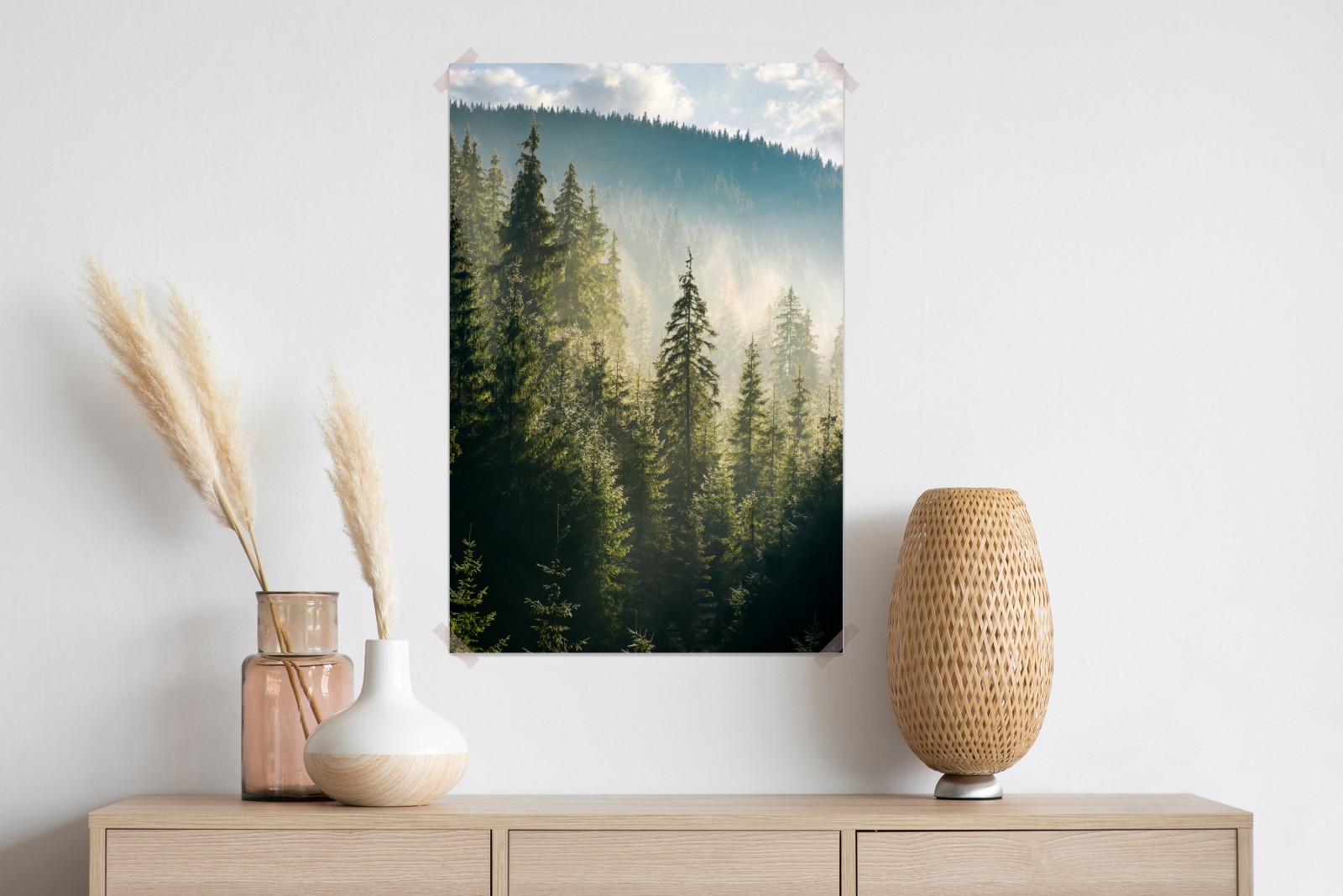 Bringen Sie mit diesem nebligen Fichtenwald im sanften Morgenlicht Ruhe und Natur in Ihr Zuhause.