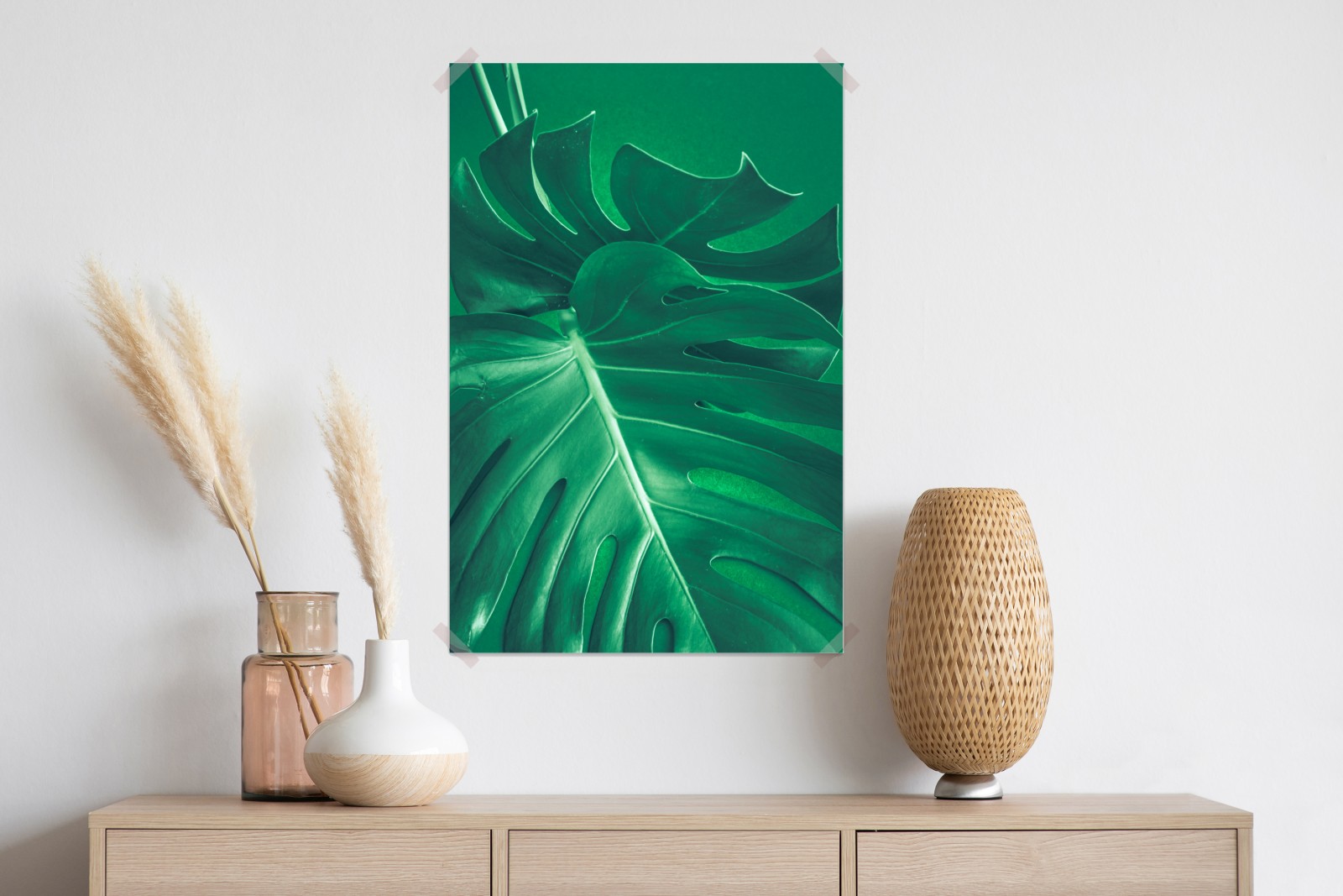 Bringen Sie tropische Ruhe in Ihr Zuhause mit einer beeindruckenden Nahaufnahme eines Monstera-Blatts, ideal für moderne und naturnahe Wohnstile.