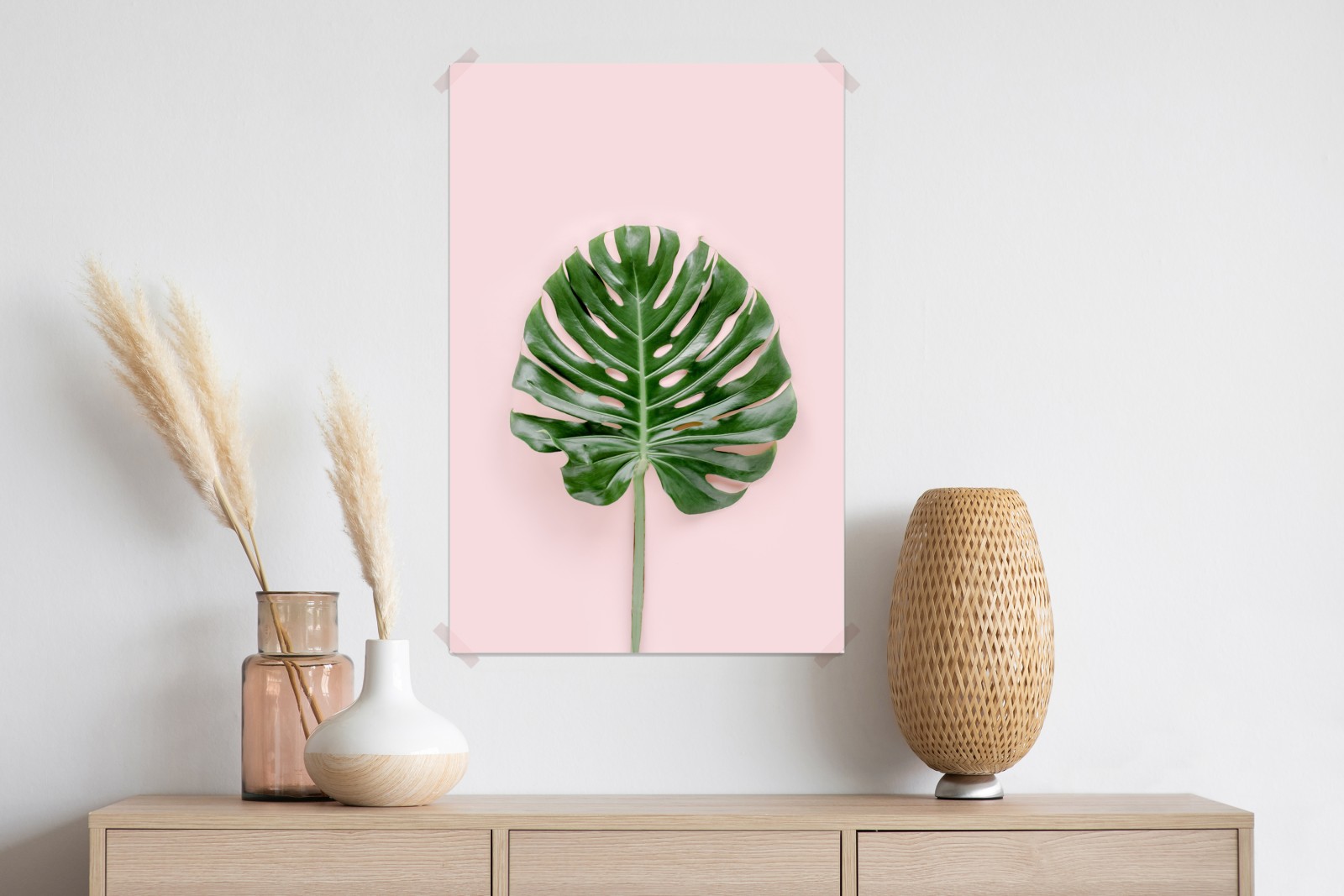 Poster Monstera-blatt auf pastell-rosa hintergrund