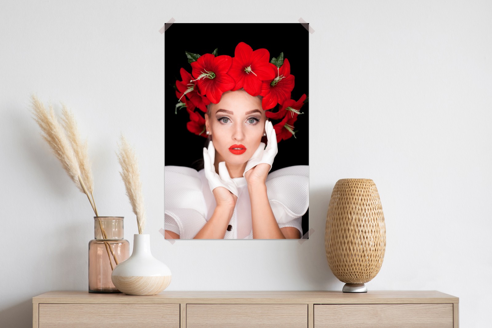 Elegantes Porträt einer Frau mit rotem Blumenkranz und weißen Handschuhen vor schwarzem Hintergrund, perfekt zur Verschönerung von Schlafzimmer oder Wohnzimmer.