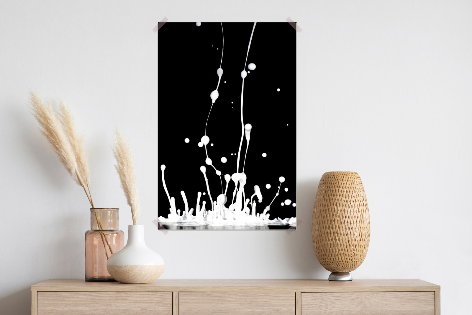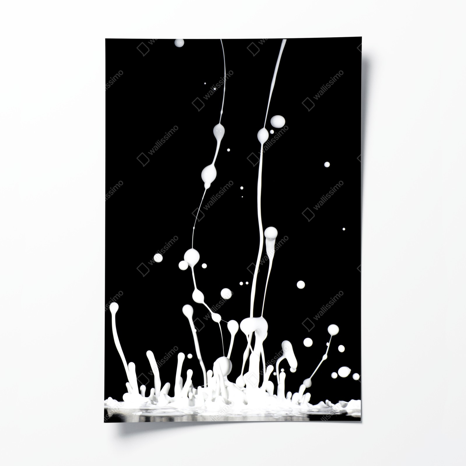 Dynamische weiße Flüssigkeitsspritzer auf schwarzem Hintergrund schaffen ein kraftvolles, minimalistisches Statement für moderne Räume.