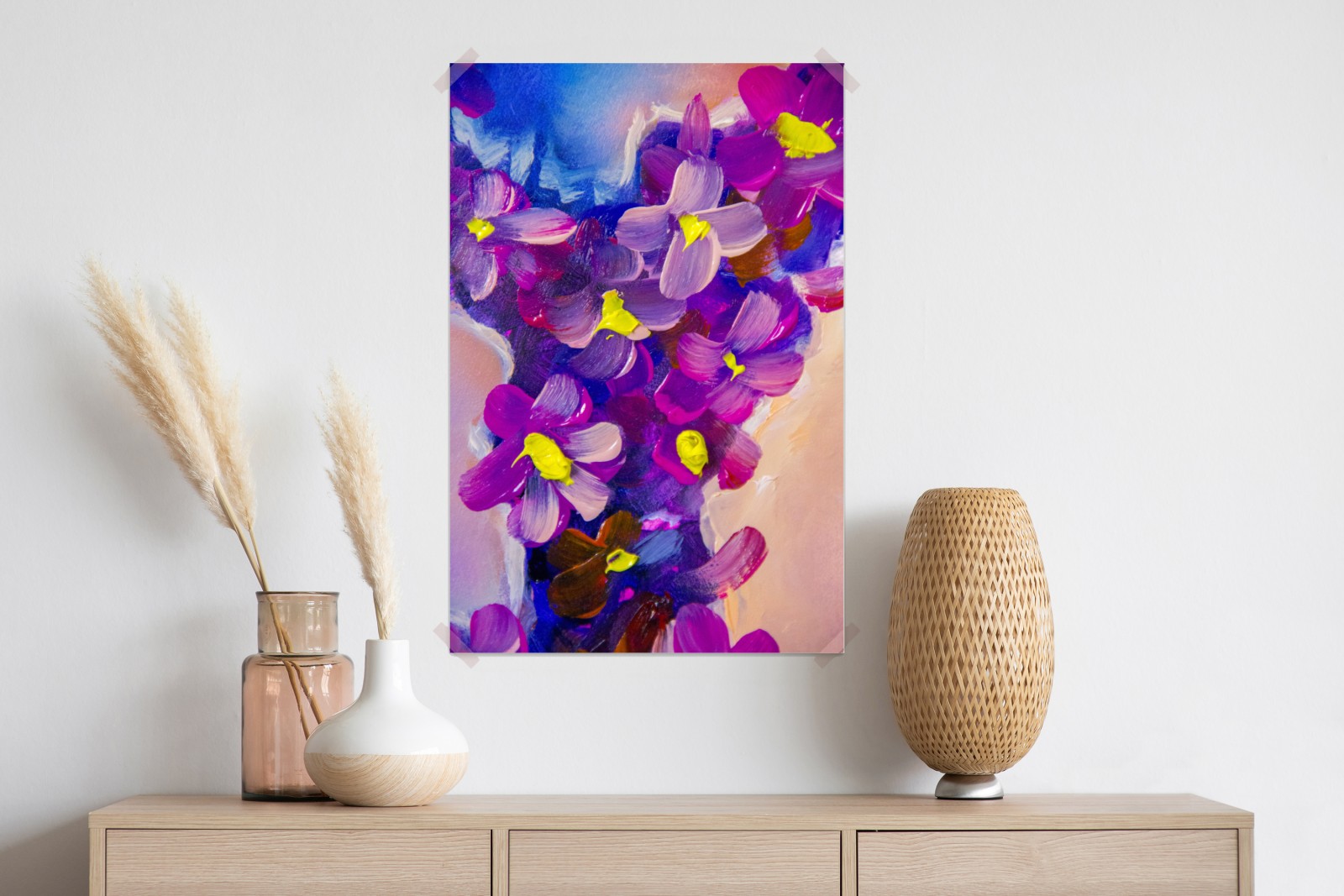 Verwandeln Sie Ihren Raum mit einer lebendigen Nahaufnahme violetter Blumen, gemalt in ausdrucksstarken Ölpinselstrichen, die Farbe und Textur hinzufügen.