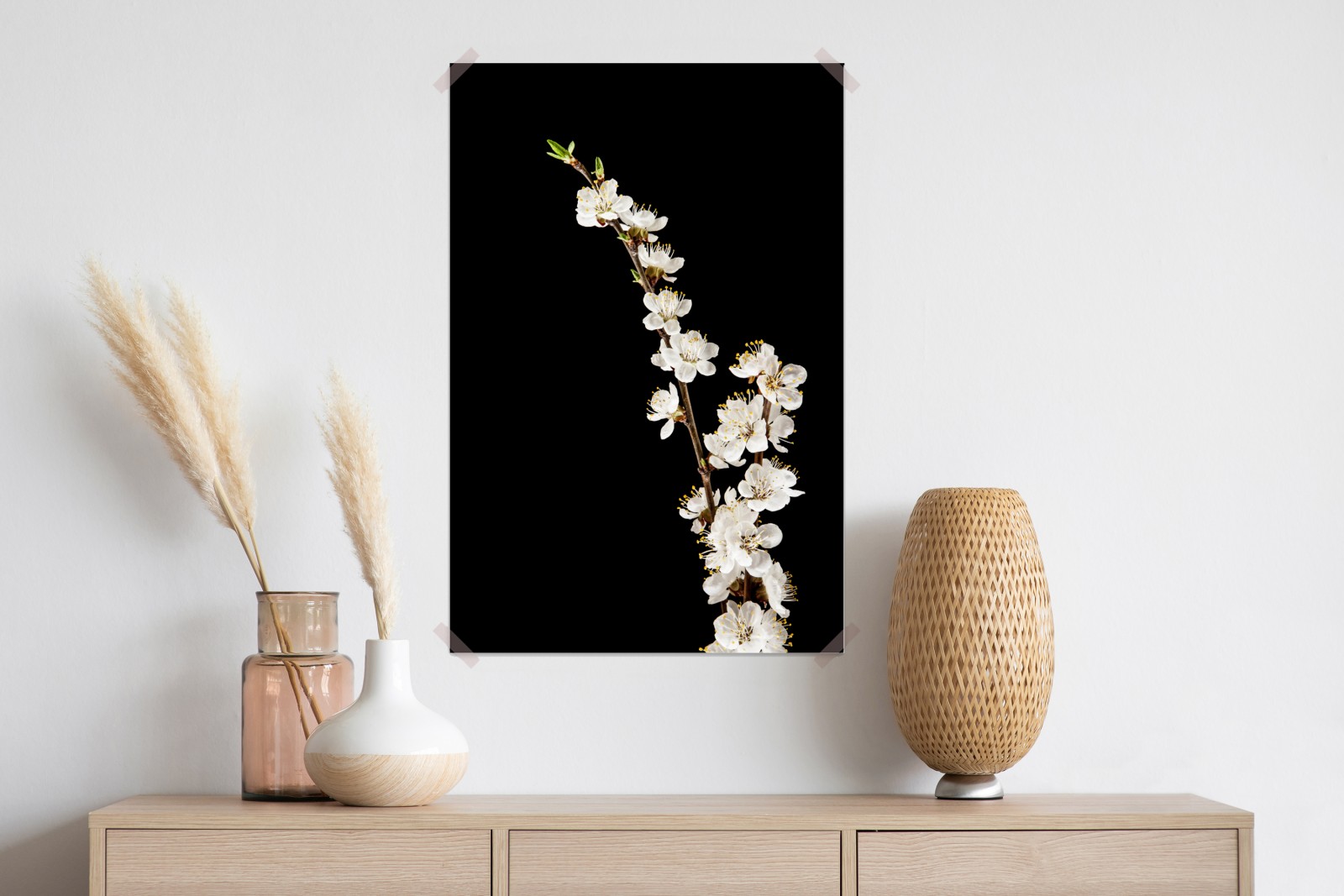 Eleganter und ruhiger botanischer Druck mit einem zarten Zweig voller Aprikosenblüten vor tiefschwarzem Hintergrund, ideal zur Schaffung minimalistischer floraler Akzente im Raum.