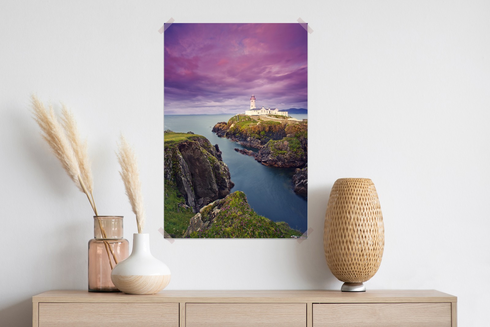 Bringen Sie ruhigen, maritimen Charme in Ihr Zuhause mit einem lila Himmel über einem Leuchtturm und dramatischen Felsen.