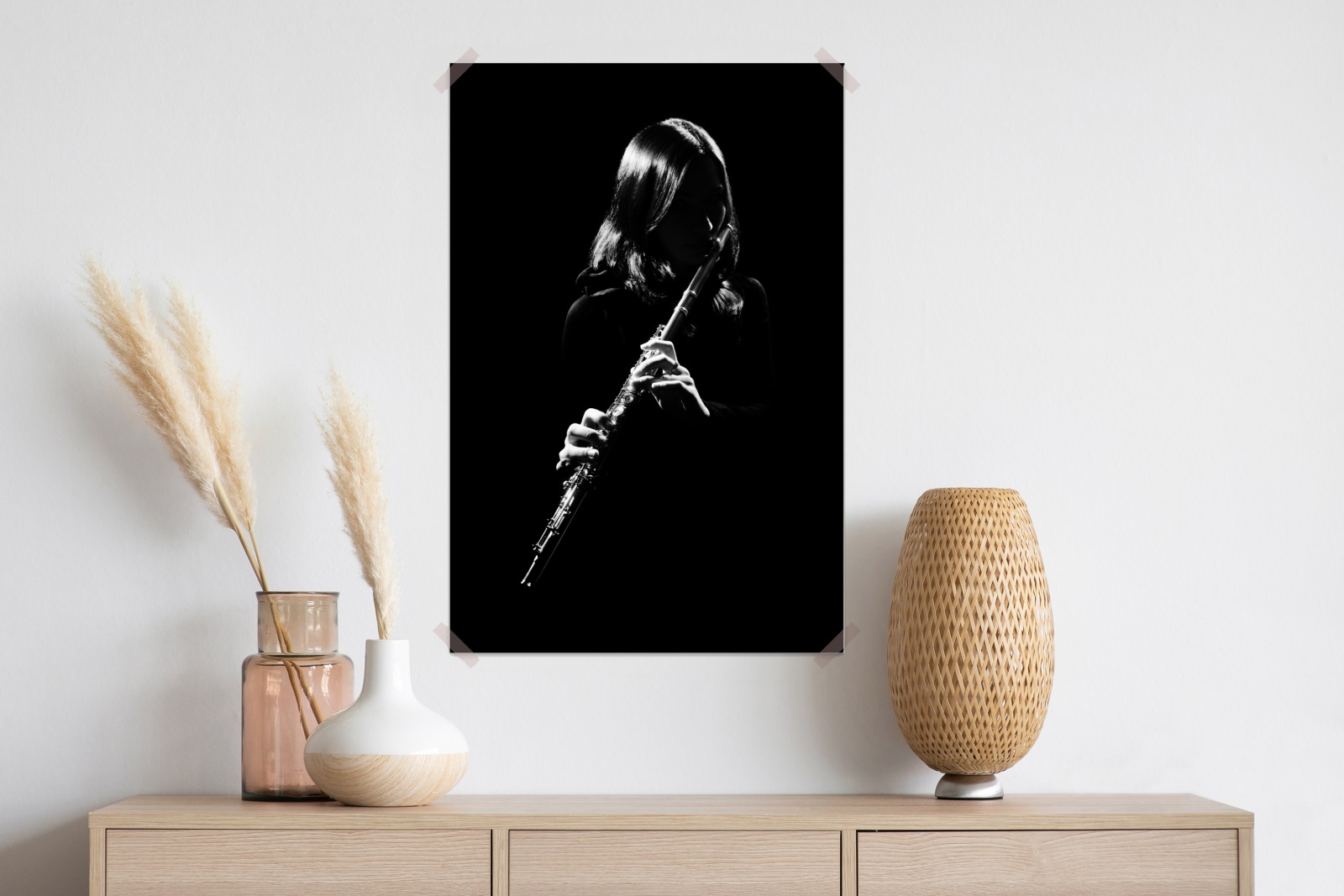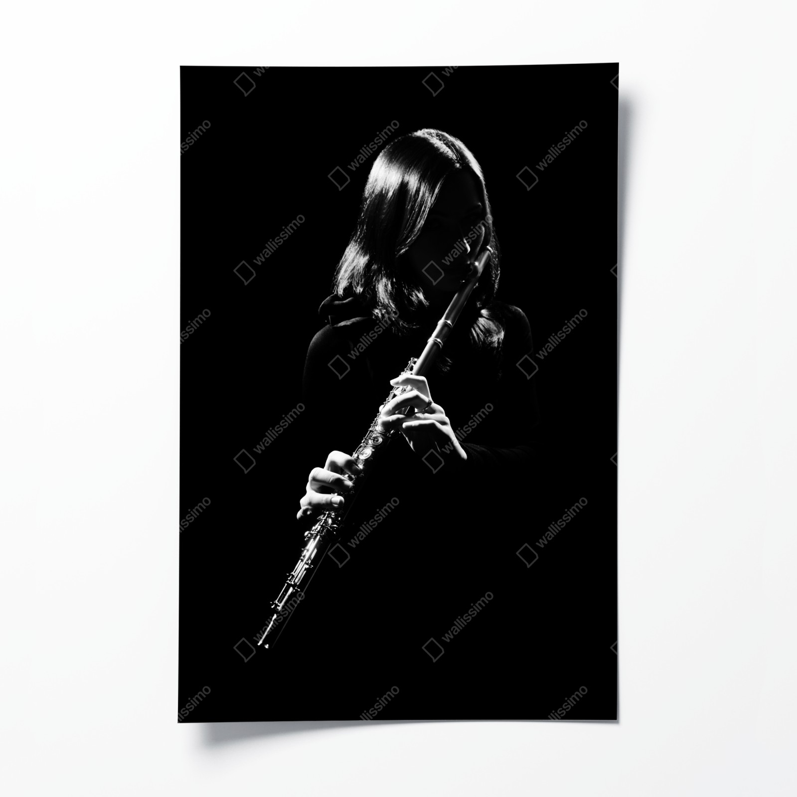 Verleihen Sie Ihrem Raum klassische Eleganz mit dieser eindrucksvollen schwarz-weißen Silhouette einer Flötistin, perfekt für moderne und minimalistische Einrichtungen.