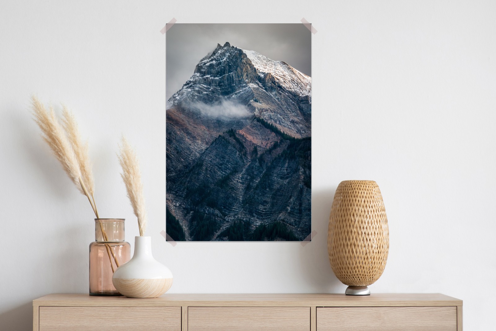 Erleben Sie die rohe Schönheit schneebedeckter Gipfel und nebliger Täler in klaren Details, ideal, um eine ruhige Bergatmosphäre in Ihr Zuhause zu bringen.