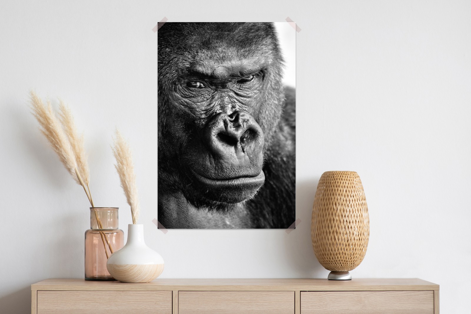 Dramatisches schwarzweiß-Porträt eines Gorillas, das jedem Raum Tiefe und natürliche Textur verleiht.