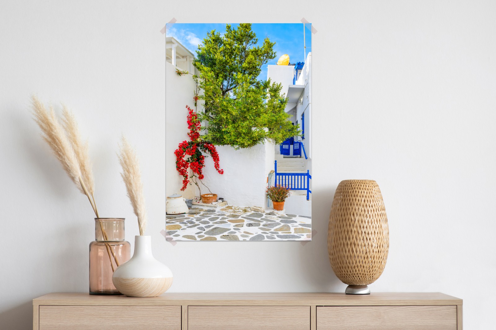Bringen Sie sonniges mediterranes Flair in Ihr Zuhause mit dieser Szene aus weiß getünchten Mauern, blauen Akzenten und hängender Bougainvillea.