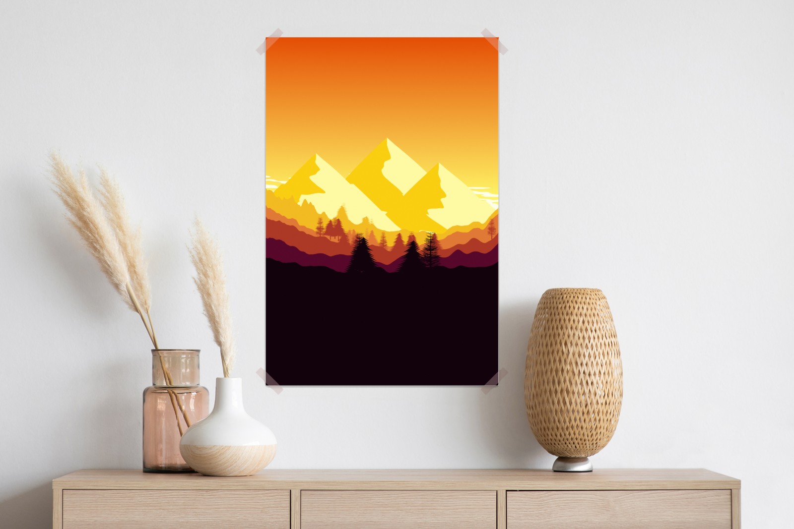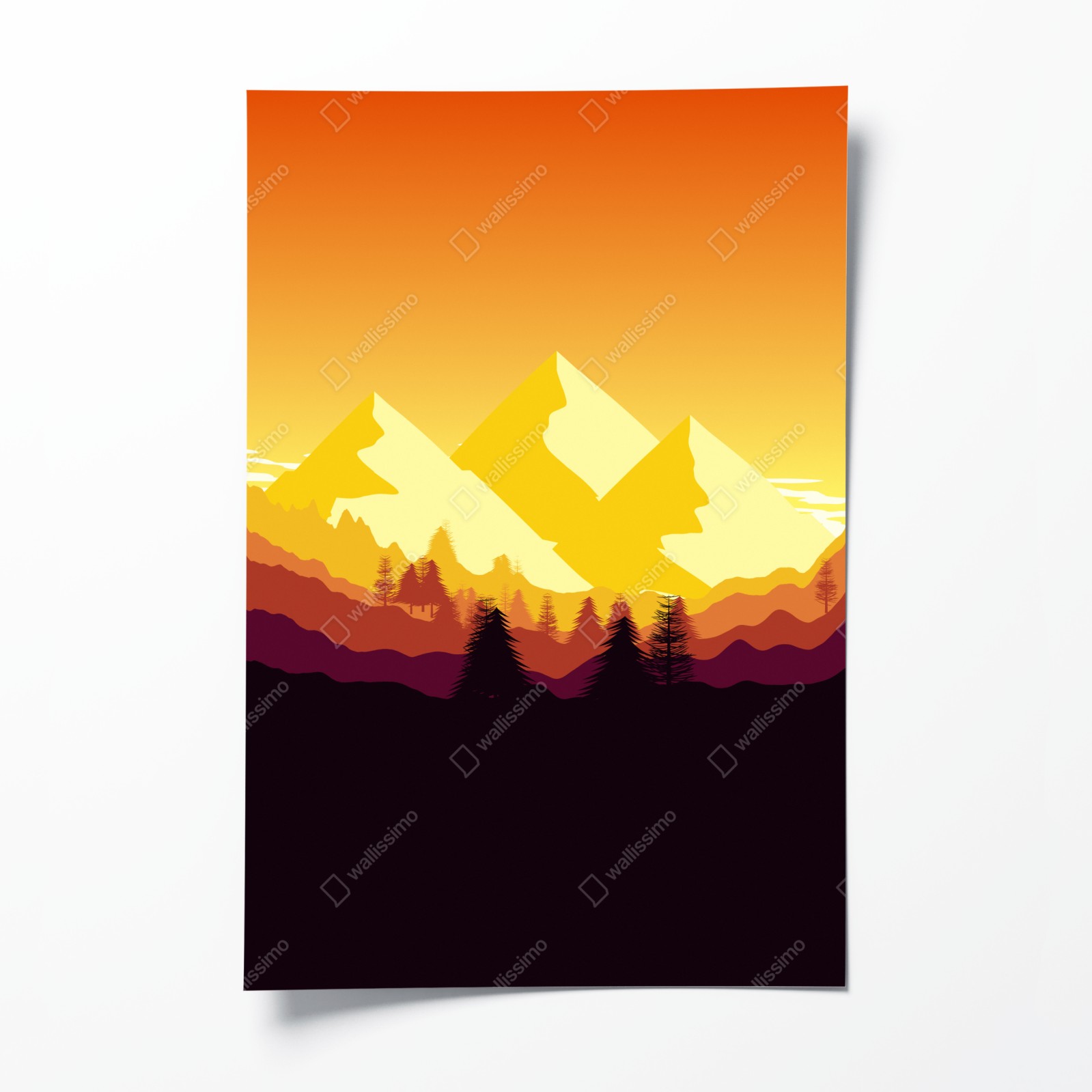 Bringen Sie warme, minimalistische Bergstimmung in Ihr Zuhause mit dieser goldenen Sonnenuntergangsillustration.