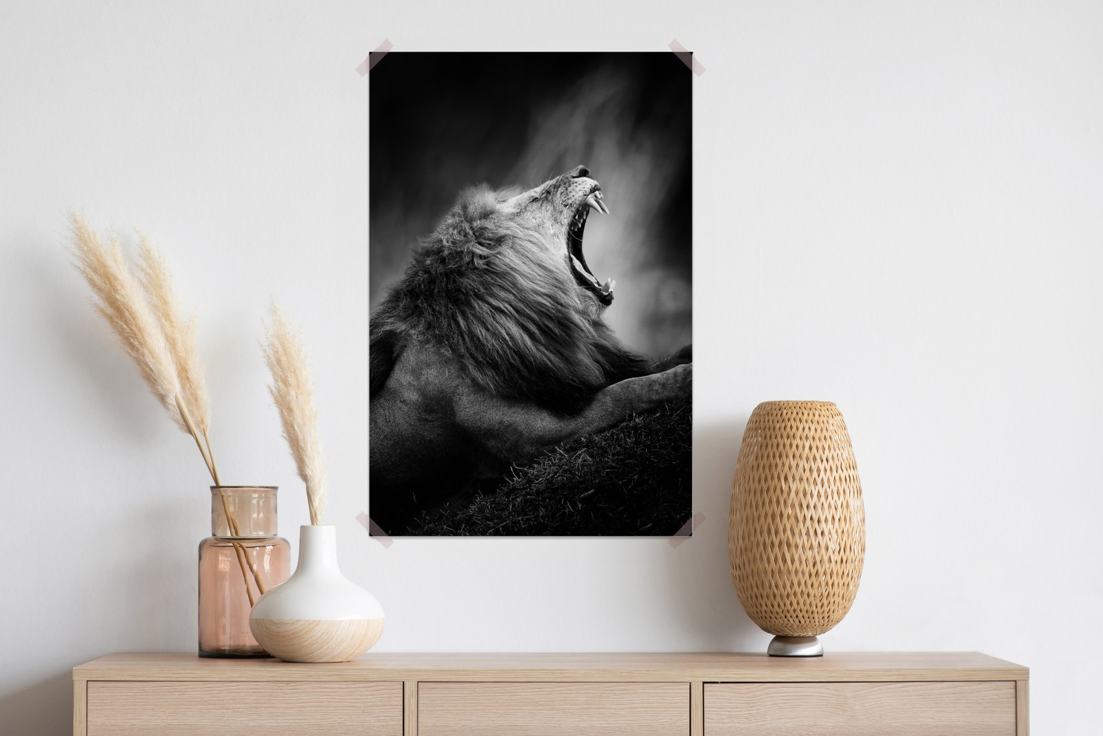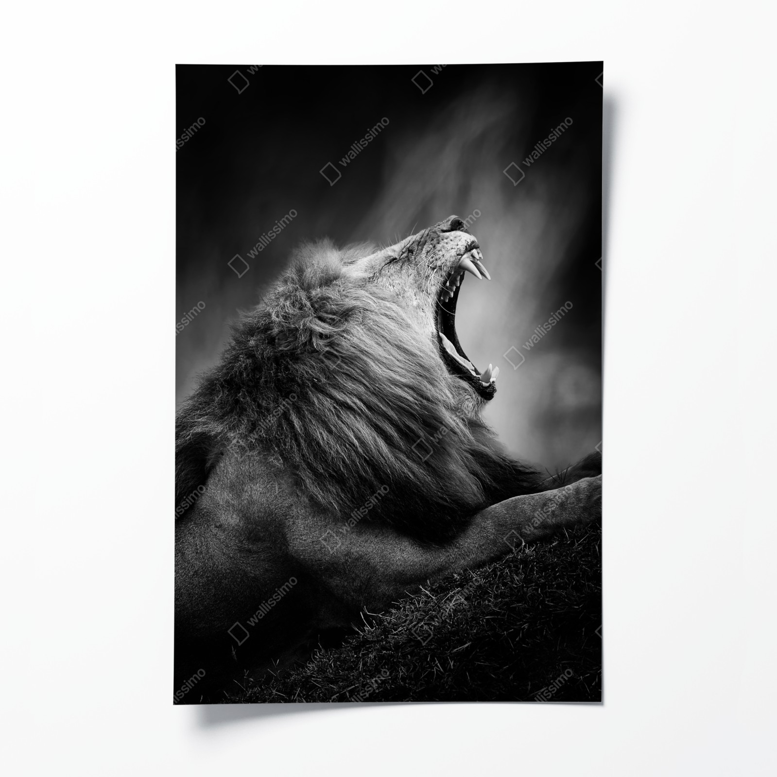 Bringen Sie kräftige Safari-Eleganz in Ihr Zuhause mit diesem dramatischen schwarz-weißen Porträt eines brüllenden Löwen, ideal für moderne Räume.