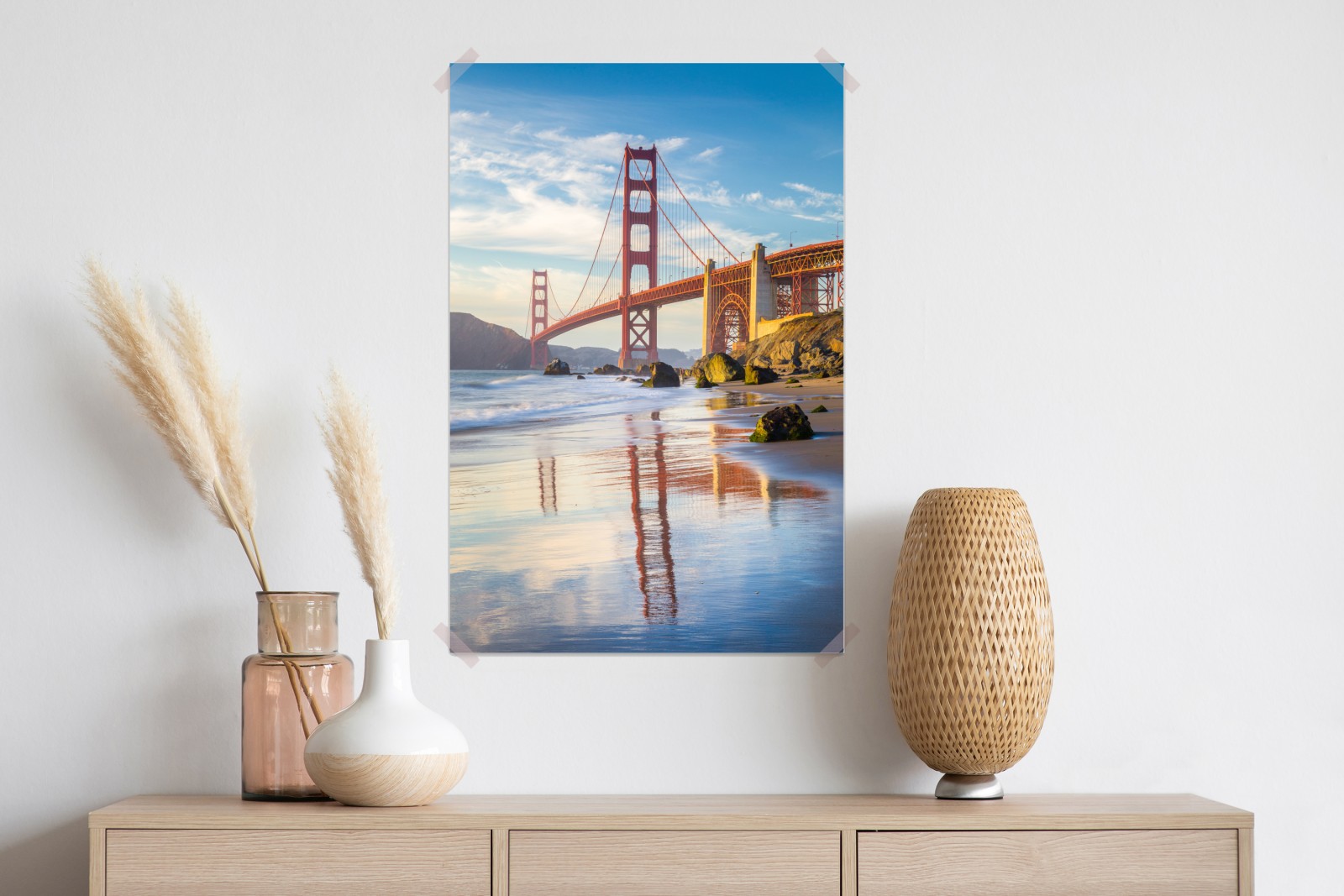 Erleben Sie die ikonische Golden Gate Bridge im warmen Licht, die sich im nassen Sand spiegelt und eine eindrucksvolle städtische Küstenszene an Ihre Wände bringt.