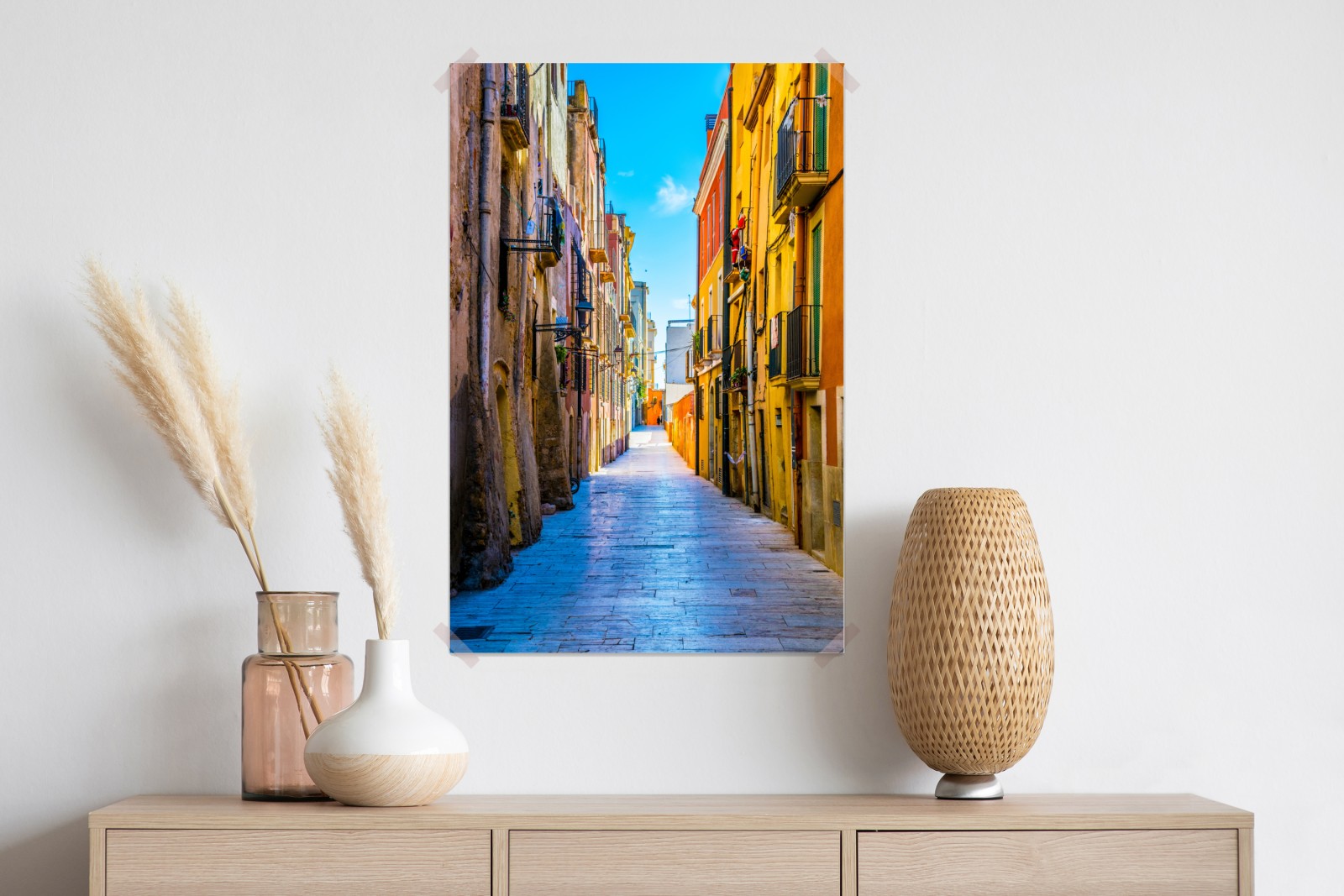 Bringen Sie mediterrane Lebendigkeit in Ihr Zuhause mit dieser sonnenbeschienenen Gasse und ihren bunten Fassaden.