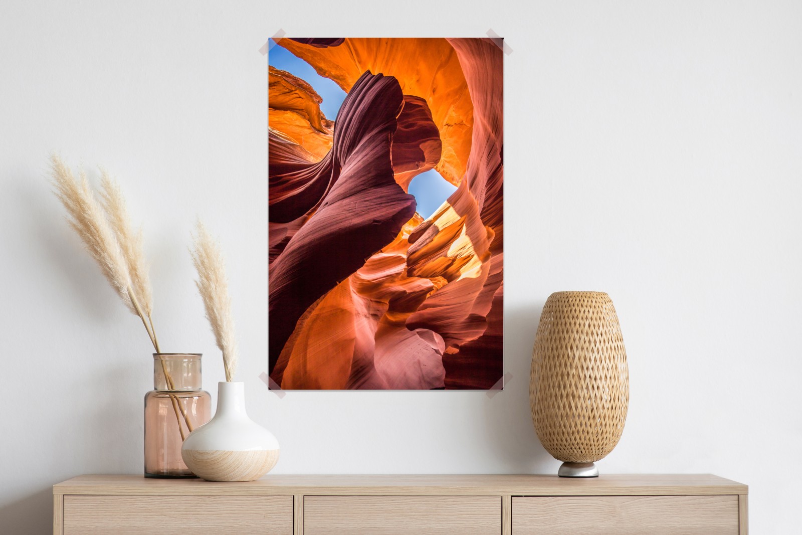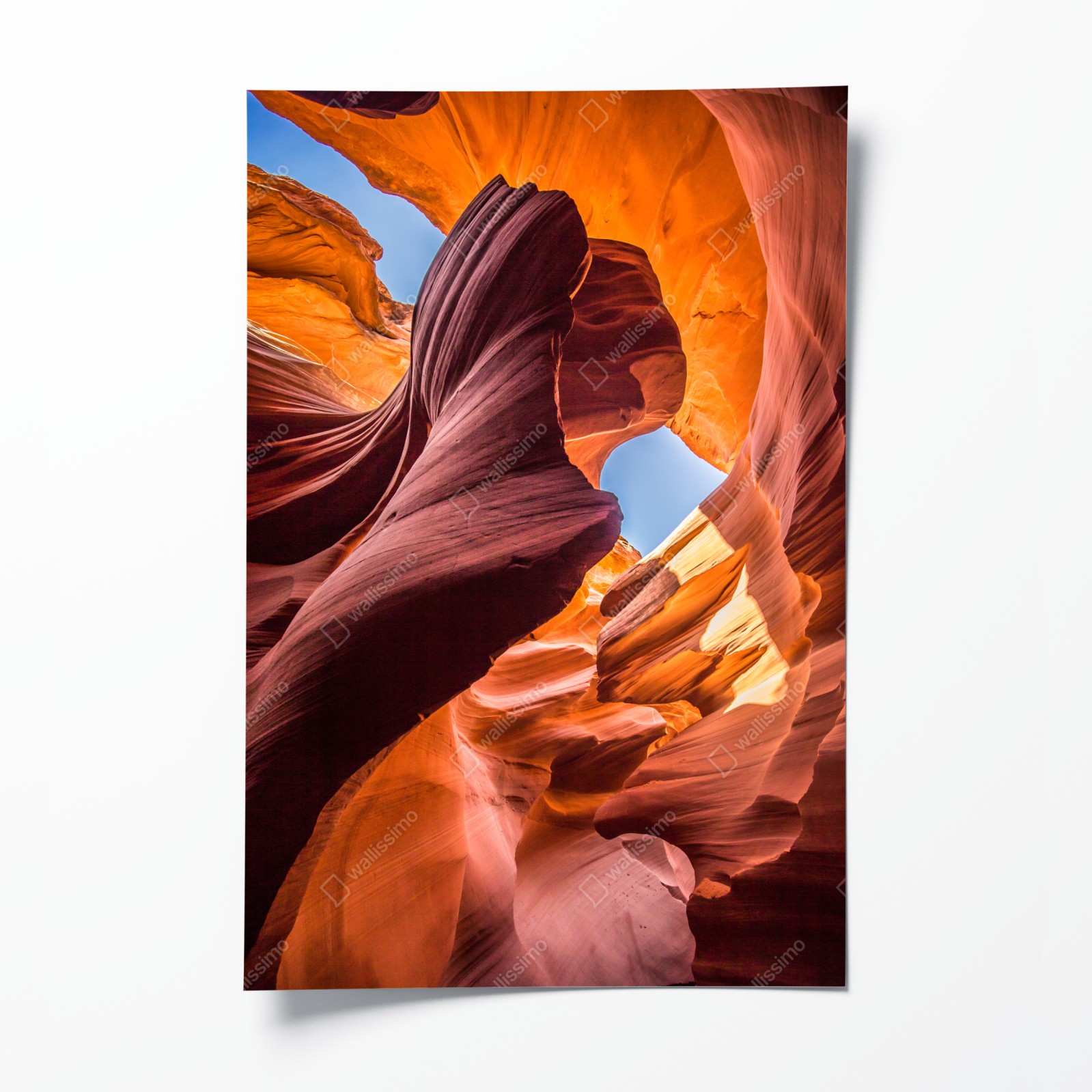 Bringen Sie die dramatische Schönheit einer sonnenbeschienenen Schlucht in Ihr Zuhause mit diesem lebendigen Druck, der fließende Felsstrukturen und warme Töne zeigt.