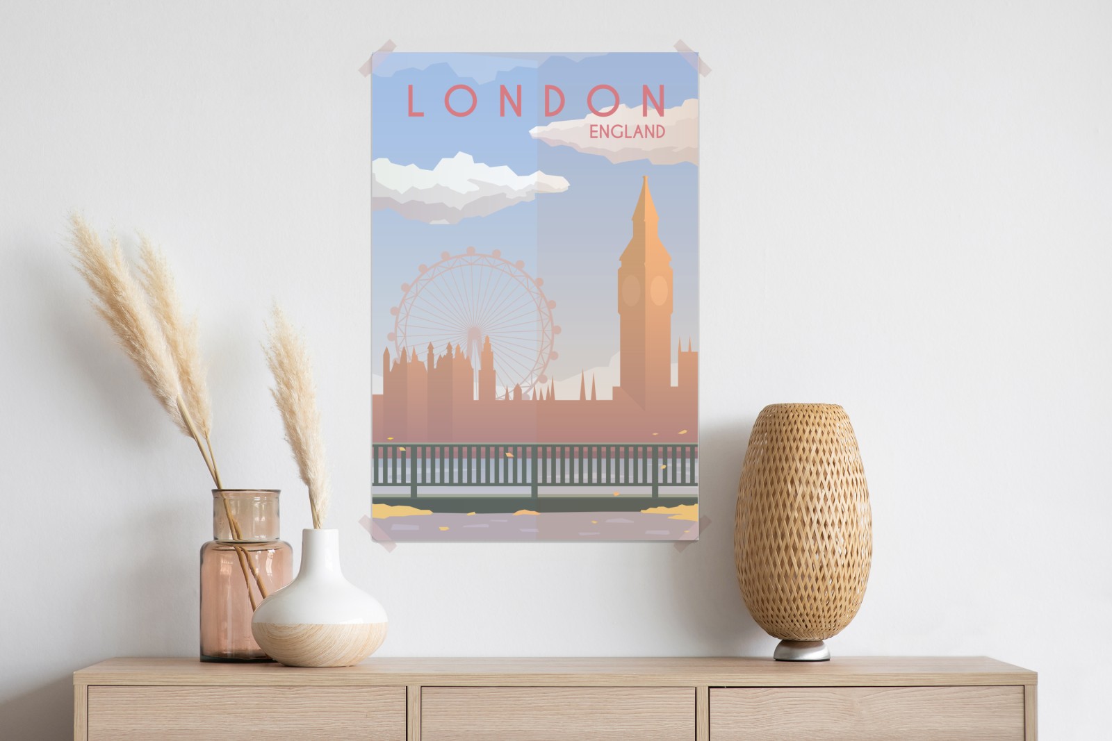 Bringen Sie den zeitlosen Charme der Londoner Skyline in Ihr Zuhause mit dieser pastellfarbenen Reiseillustration mit Big Ben und dem London Eye.