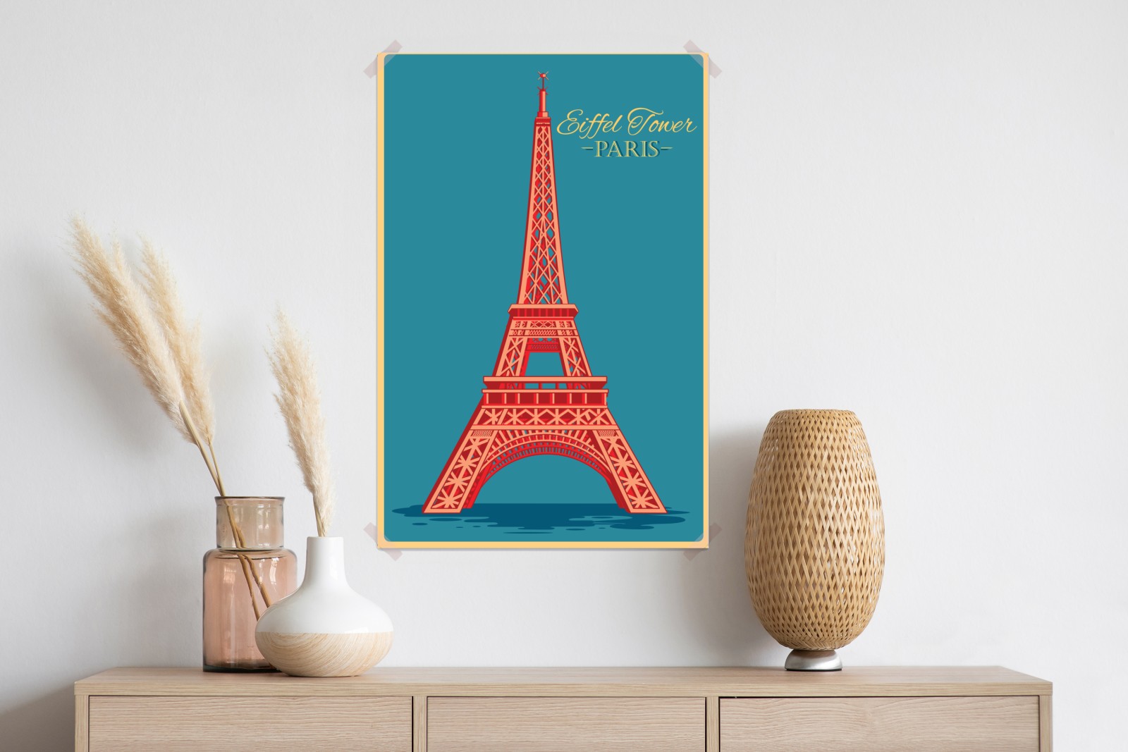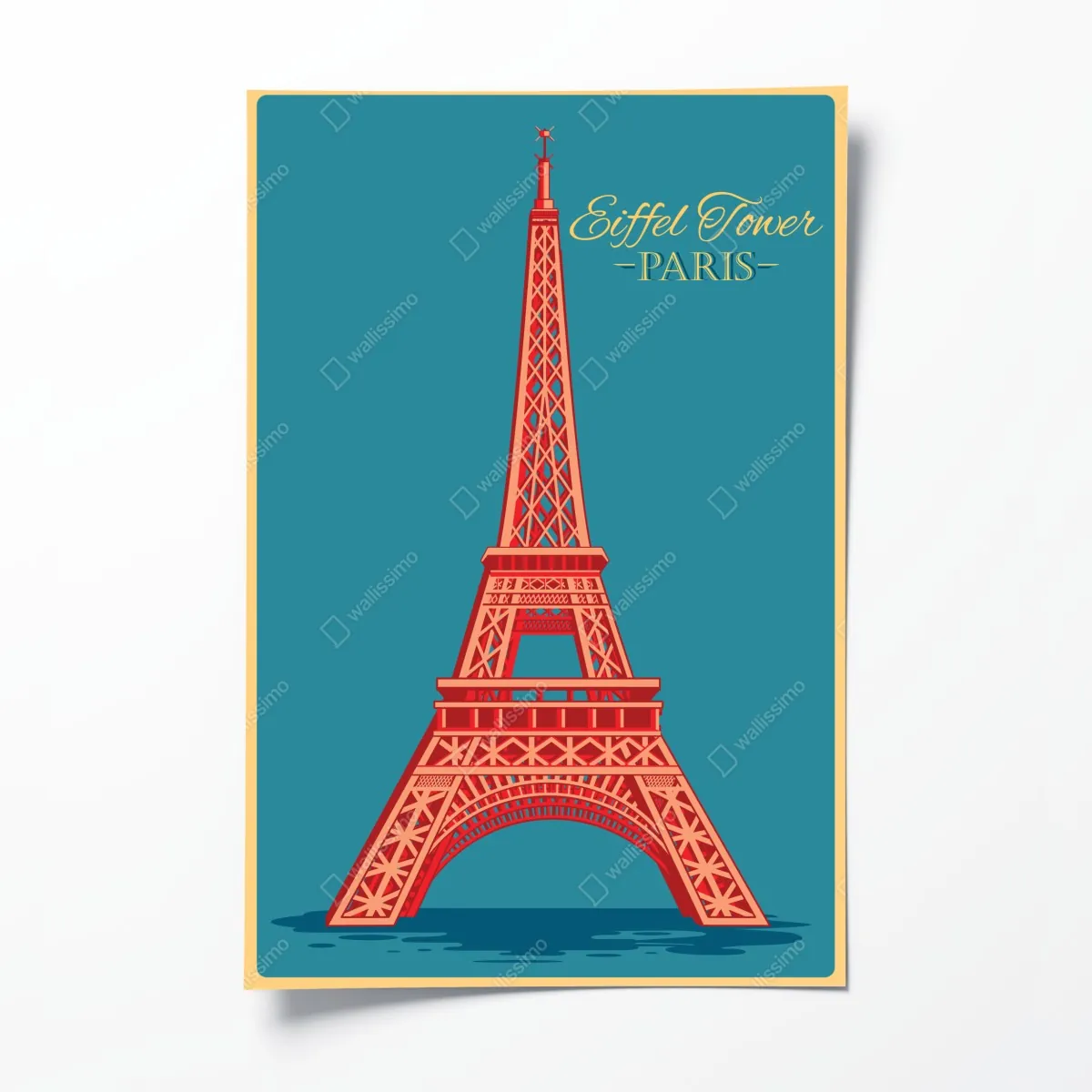 Versetzen Sie sich mit dieser Retro-Illustration des Eiffelturms in lebhaften Rot- und Türkistönen nach Paris und verleihen Sie Ihrem Raum einen Vintage-Charakter.