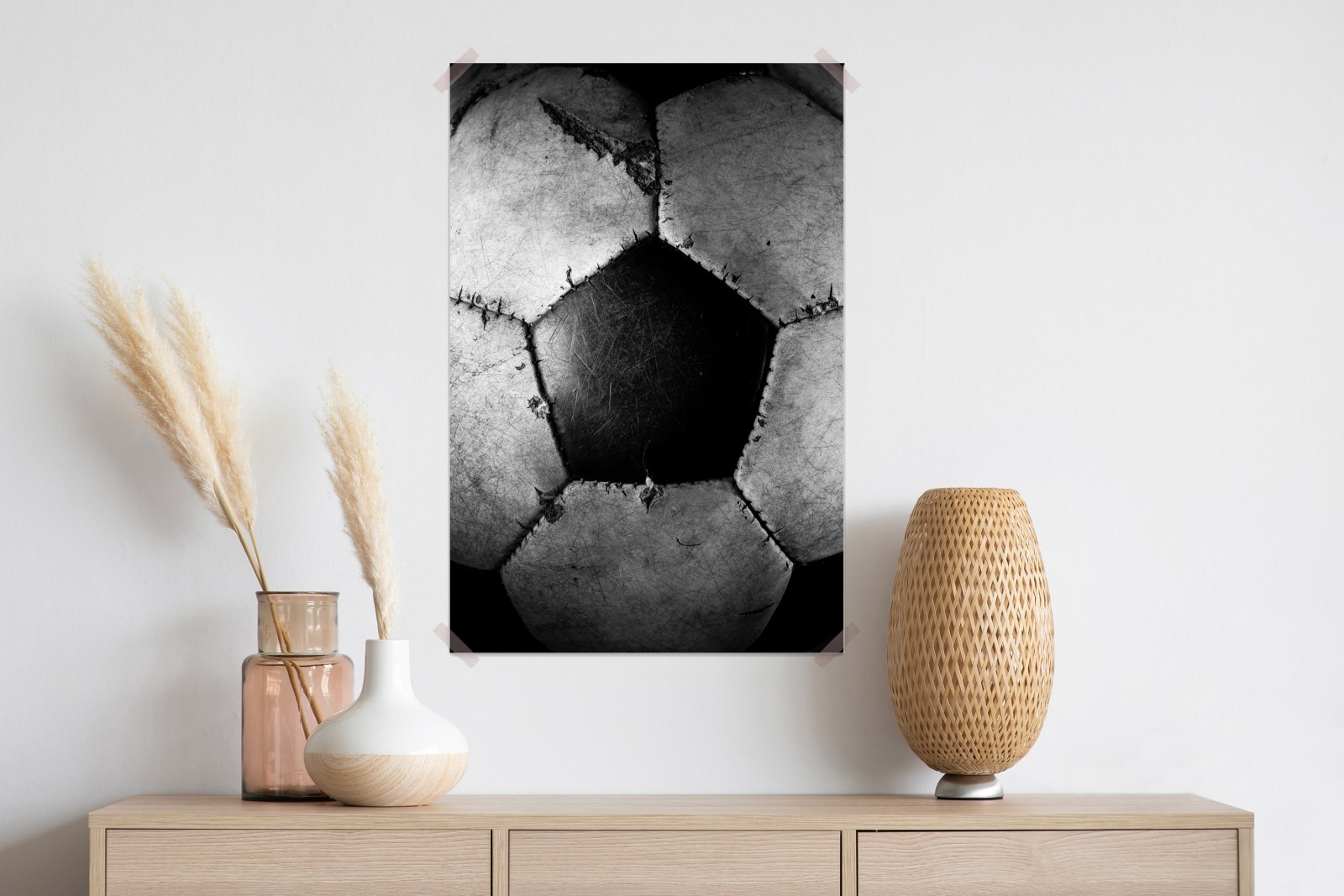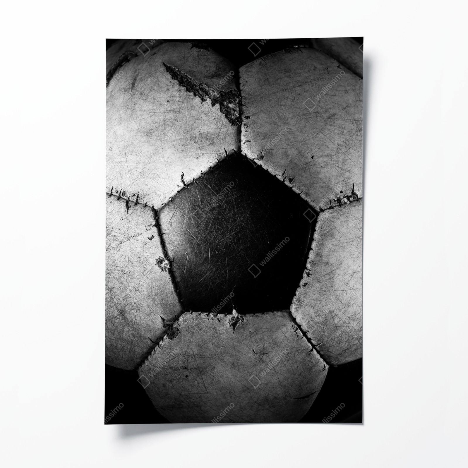 Verleihen Sie Ihren Wänden sportliche und urbane Energie mit einer kontrastreichen Nahaufnahme eines abgenutzten Fußballs, ideal für Fans und moderne Interieurs.