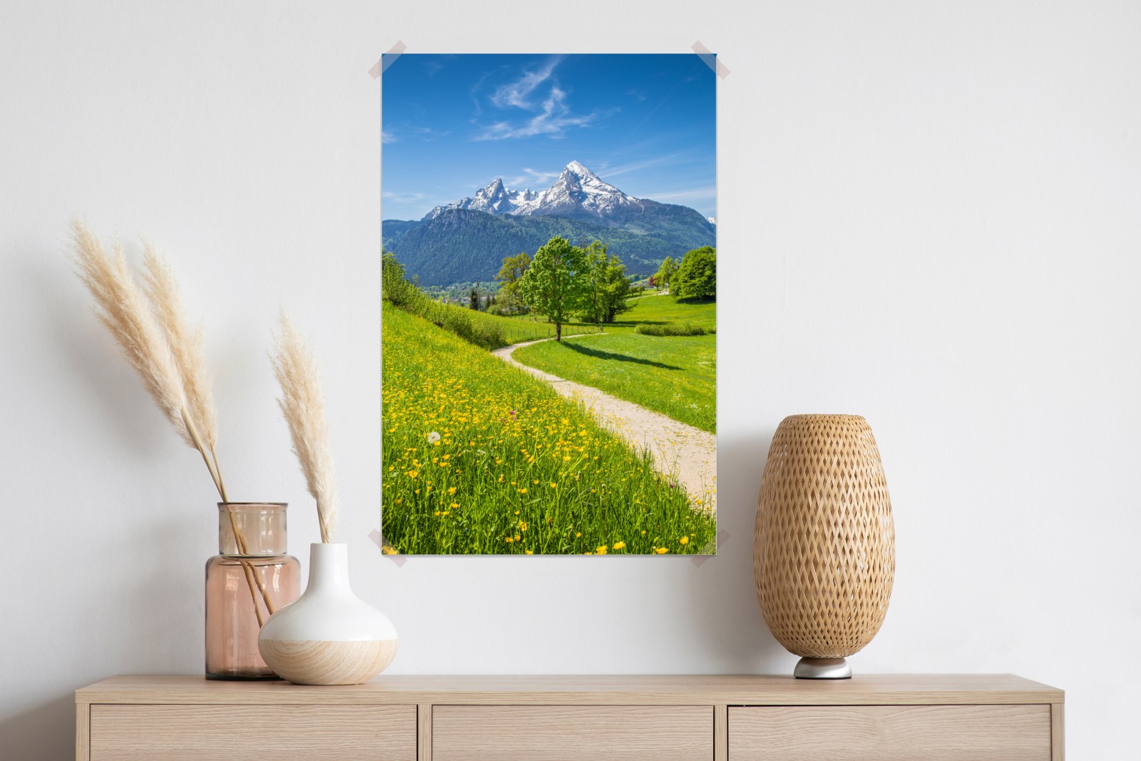 Bringen Sie die Ruhe der Alpenwiesen in Ihr Zuhause mit dieser lebendigen Landschaft mit geschwungenem Pfad, wilden Blumen und schneebedeckten Gipfeln.