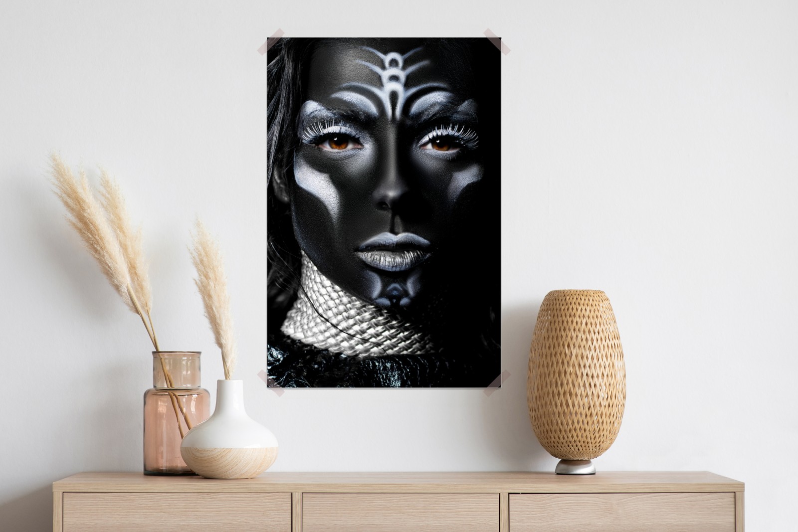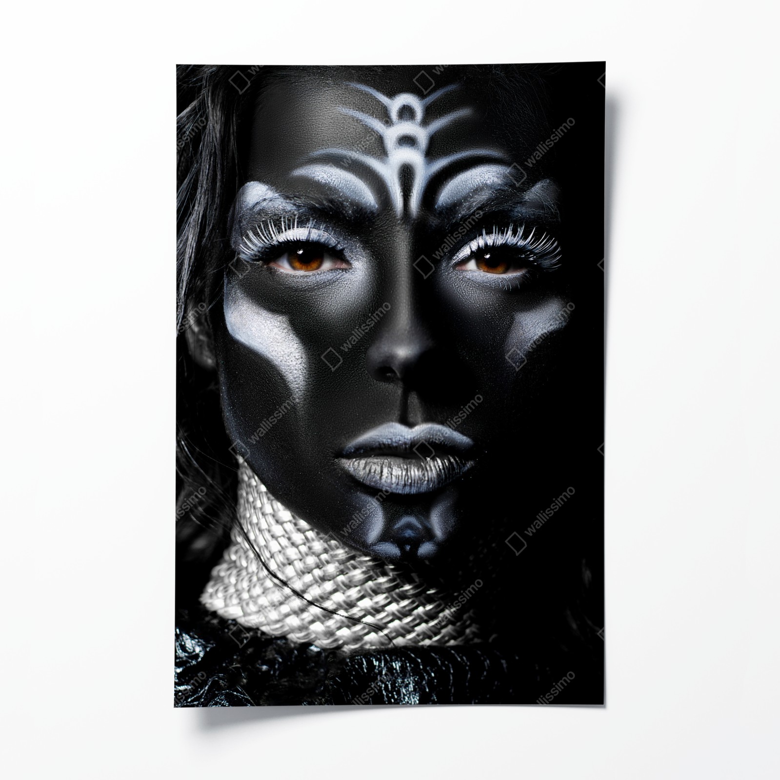 Ausdrucksstarkes Close-up mit dramatischer schwarzer Körperbemalung und kontrastierenden weißen Akzenten, perfekt für moderne Innenräume.