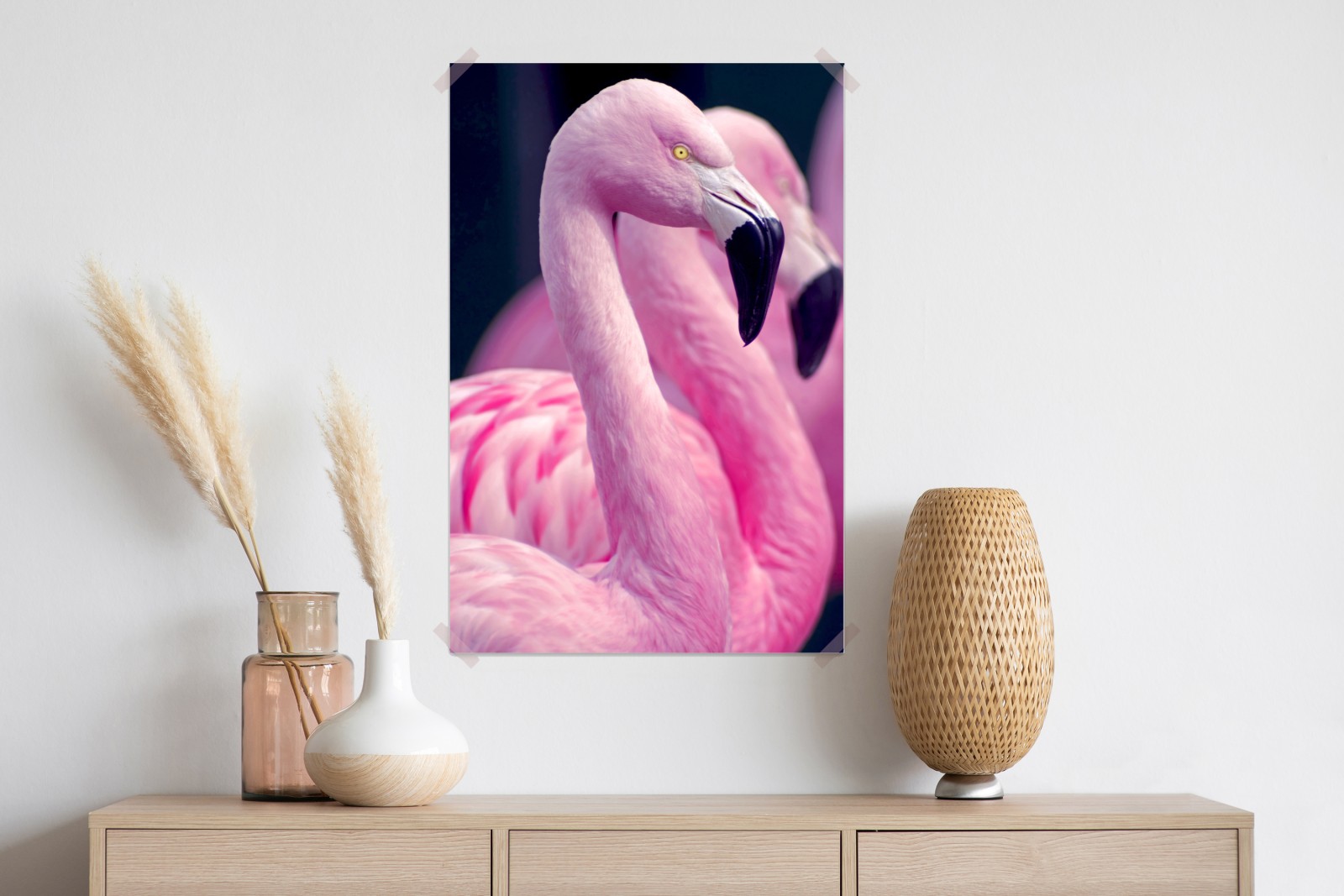 Bringen Sie tropische Eleganz in Ihr Zuhause mit diesem Nahaufnahme-Porträt zweier rosa Flamingos in lebendigen Farben.
