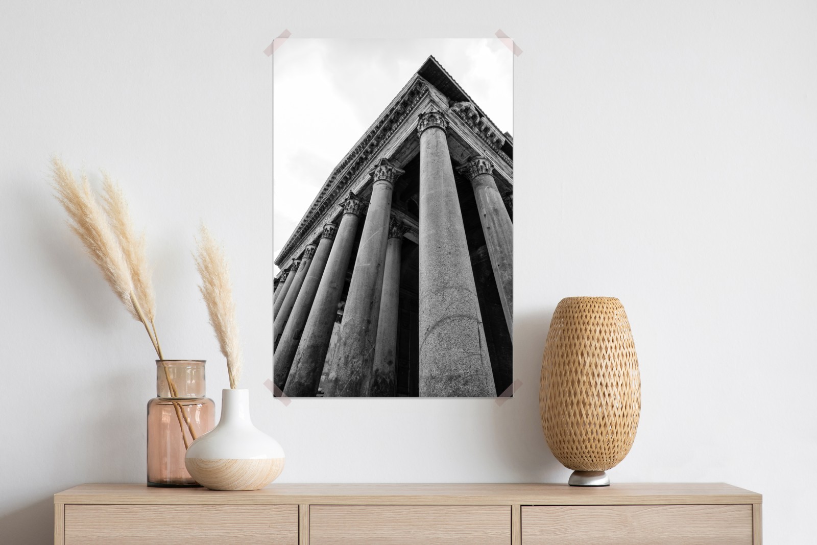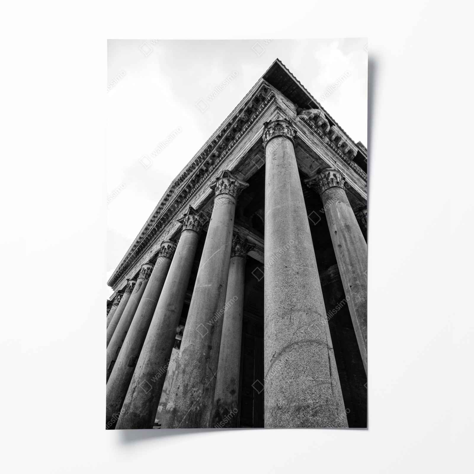 Verleihen Sie Ihrem Raum eine dramatische schwarz-weiße Ansicht der monumentalen Säulen des Pantheon in Rom, ideal für moderne, minimalistische Einrichtungen.