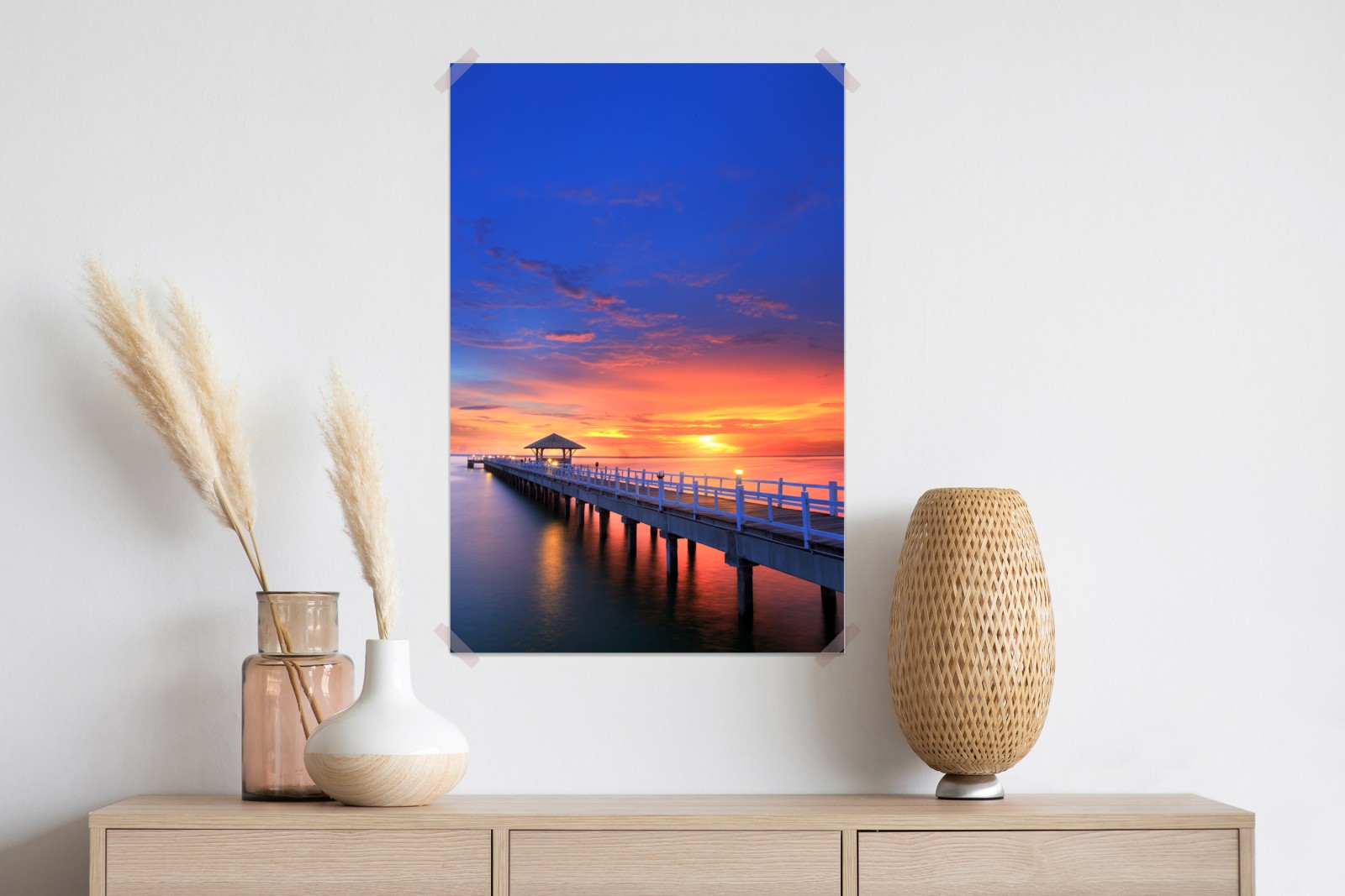 Bringen Sie ruhige Küstenstimmung in Ihr Zuhause mit einem intensiven Sonnenuntergang über einem hölzernen Steg.