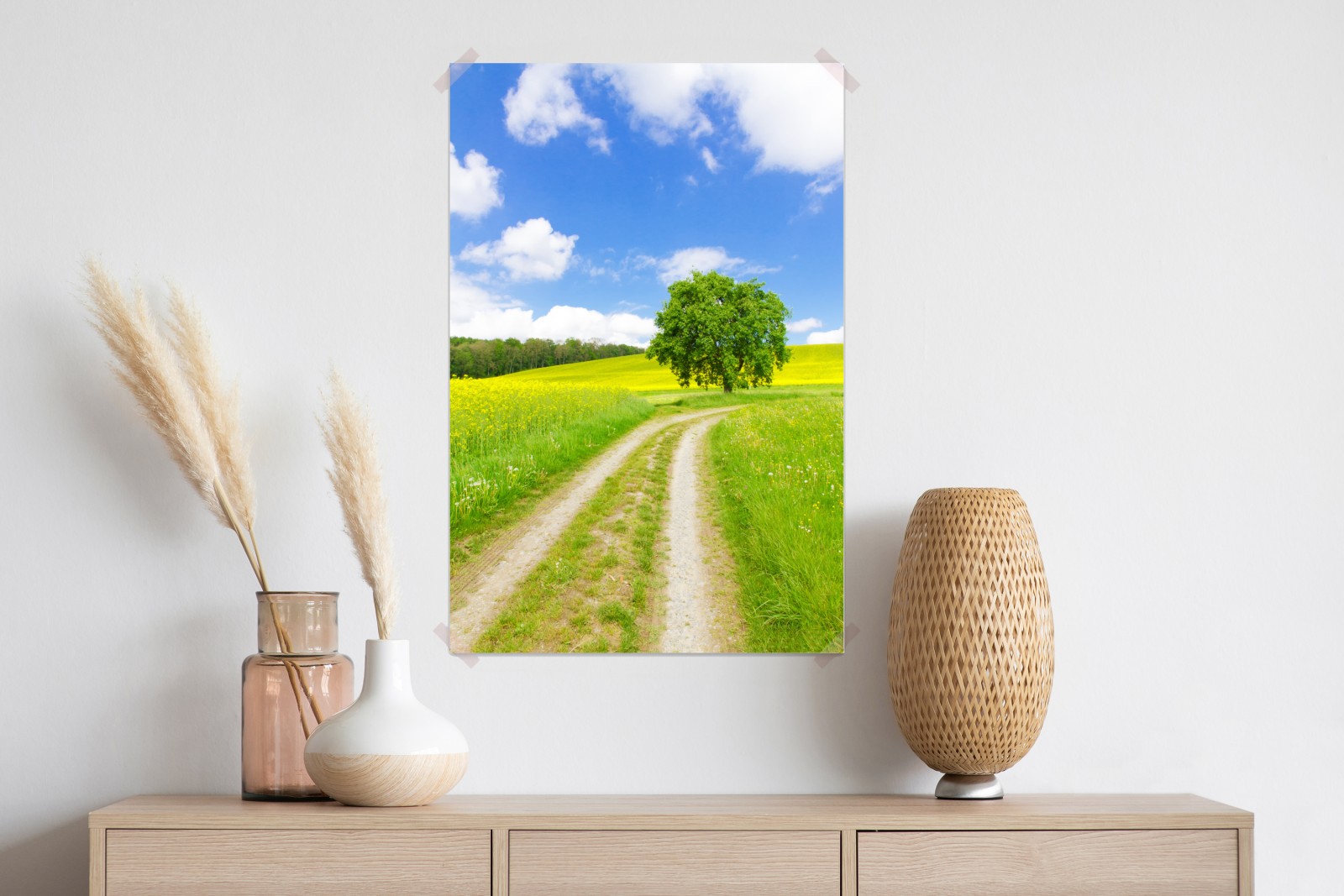 Bringen Sie Ruhe und natürliche Schönheit in Ihr Zuhause mit diesem hellen Landschaftsbild mit sonnigem Feldweg, einsamem Baum und strahlend blauem Himmel.