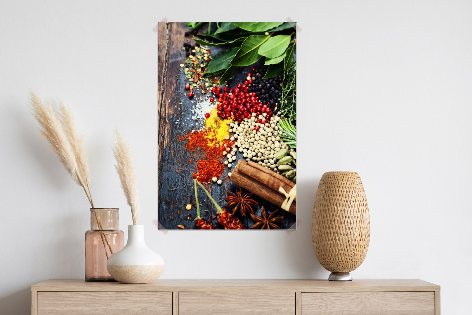 Poster Buntes gewürzsortiment auf rustikalem holz