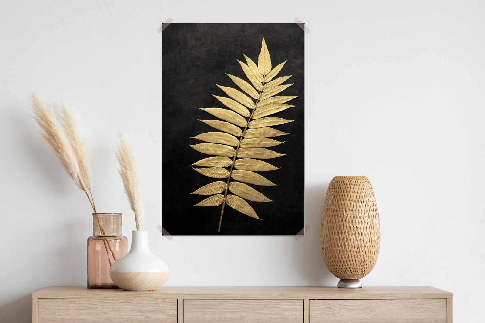 Verleihen Sie Ihrem Raum Eleganz mit einem goldenen Farn auf dunklem, strukturiertem Hintergrund. Das minimalistische Metallfinish bringt modernen Stil und Tiefe in jedes Zimmer.