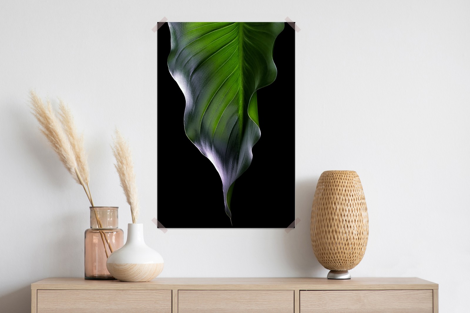 Poster Elegantes grünes blatt auf schwarzem hintergrund