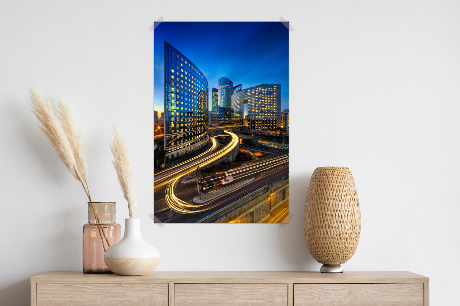 Fangen Sie die Energie der modernen Metropole mit diesem lebendigen Abendhimmel-Druck ein, der dynamische Lichtspuren und markante Glasgebäude zeigt und jeden Raum belebt.